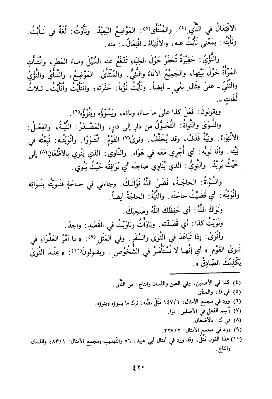 الافْتِعَالُ في النَّأْيِ . والمُنْتَأَى : المَوْضِعُ البَعِيْدُ . ونَأَوْتُ : لُغَةٌ في نَأَيْتُ . ونَأَيْتُه : بمَعْنى نَأَيْتُ عنه ، والانْتِيَاءُ افْتِعَالٌ : منه . والنُّؤْيُ : حَفِيْرَةٌ تُحْفَرُ حَوْلَ الخِبَاءِ تَدْفَعُ عنه السَّيْلَ وماءَ المَطَرِ ، وانْتَأَتِ المَرْأَةُ حَوْلَ بَيْتِها ، والجَمِيْعُ الآنَاءُ والنُّئِيُّ . والمُنْتَأَى : المَوْضِعُ ، والنَّأْيُ والنُّؤْيُ والنِّئْيُ على مِثَالِ نِعْيٍ أيضاً . ونَأَيْتُ نُؤْياً : حَفَرْته ؛ وانْتَأَيْتُ وأَنْأَيْتُ ثلاثُ لُغَاتٍ . ويقولونَ : فَعَلَ كذا على ما ساءَه وناءَه ، ويَسُوْرُه ويَنُوْؤُه . والنَّوَى والنَّوَاةُ : التَّحَوُّلُ من دارٍ إلى دارٍ ، والمَصْدَرُ : النِّيَّةُ ، والفِعْلُ : الانْتِوَاءُ . ونِيَّةٌ قَذَفٌ ، وقد يُخَفَّفُ . ونَوى القَوْمُ : انْتَوَوْا . وأنْوَيْتُه : تَبِعْتُه في نِيَّتِه . وأنَا نَوِيُّه : أي أَجْرِي مَعَه في هَوَاه . والنّاوي : الذي يَنْوِي بالأظْعَانِ إلى حَيْثُ يُرِيْدُ . والنَّوِيُّ : الذي يُنَاوِي صاحِبَه أي يُوَافِقُه حَيْثُ يَنْوي . والنَّوَاةُ : الحاجَةُ ، قَضَى اللهُ نَوَاتَكَ . وجاءني في حاجَةٍ فنَوَيْتُه بنَوَاتِه وأنْوَيْتُه : أي قَضَيْتُ حاجَتَه . والنِّيَّةُ : الحاجَةُ أيضاً . ونَوَاكَ اللهُ : أي حَفِظَكَ اللهُ وصَحِبَكَ . ونَوَيْتُ كذا : أي قَصَدْته . وناوَأْتُ وناوَيْتُ في القَصْدِ : واحِدٌ . وأنْوَى : إذا تَبَاعَدَ في النَّوَى والسَّفَرِ . وفي المَثَلِ : ' ما أمْرُ العَذْرَاءِ في نَوى القَوْمِ ' أي إنَّها لا تُسْتَأْمَرُ في الشُّخُوْصِ . ويقولونَ : ' عِنْدَ النَّوَى يَكْذِبُكَ الصّادِقُ ' .