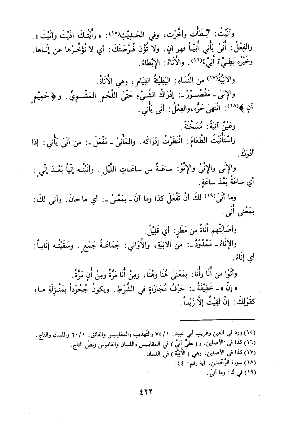 وآنَيْتُ : أبْطَأْت وأخَّرْت ، وفي الحَدِيْثِ : ' رَأَيْتُكَ آذَيْتَ وآنَيْتَ ' . والفِعْلُ : أَنَى يَأْني أُنِيّاً فهو آنٍ . ولا تُؤْنِ فُرْصَتَكَ : أي لا تُؤَخِّرْها عن إنَاها . وخَيْرُه بَطِيْءٌ أَنِيْءٌ . والأَنَاءُ : الإِبْطَاءُ . والآنِيَّةُ من النِّسَاءِ : البَطِيْئَةُ القِيَامِ ، وهي الأَنَاةُ . والإِنى مَقْصُوْرٌ : إدْرَاكُ الشَّيْءِ حَتّى اللَّحْمِ المَشْوِيِّ . و ' حَمِيْمٍ آنٍ ' : انْتَهى حَرُّه ، والفِعْلُ : أنَى يَأْني . وعَيْنٌ آنِيَةٌ : مُسَخَّنَةٌ . واسْتَأْنَيْتُ الطَّعَامَ : انْتَظَرْتُ إدْرَاكَه . والمَأْنى مَفْعَلٌ : من أنَى يَأْني : إذا أدْرَكَ . والإِنَى والإِنْيُ والإِنْوُ : ساعَةٌ من ساعَاتِ اللَّيْلِ . وأتَيْتُه إنْياً بَعْدَ إنْيٍ : أي ساعَةً بَعْدَ ساعَةٍ . وما أنَى لكَ أنْ تَفْعَلَ كذا وما آنَ بمَعْنىً : أي ما حانَ . وآنى لكَ بمَعْنى أَنَى . وأصَابَتْهم أَنَاةٌ من مَطَرٍ : أي قَلِيْلٌ . والإِنَاءُ مَمْدُوْدٌ : من الآنِيَةِ ، والأَوَاني : جَمَاعَةُ جَمْعٍ . وسَقَيْتُه إنَاياً : أي إنَاءً . وأتَوْا من أُنَا وأُنَا : بمَعْنى هُنَا وهُنَا ، ومِنْ أُنَا مَرَّةً ومِنْ أُنٍ مَرَّةً . ' إنْ ' خَفِيْفَةٌ : حَرْفُ مُجَازَاةٍ في الشَّرْطِ . ويكونُ جُحُوْداً بمَنْزِلَةِ ما ؛ كقَوْلِكَ : إنْ لَقِيْتُ إلاَّ زَيْداً .