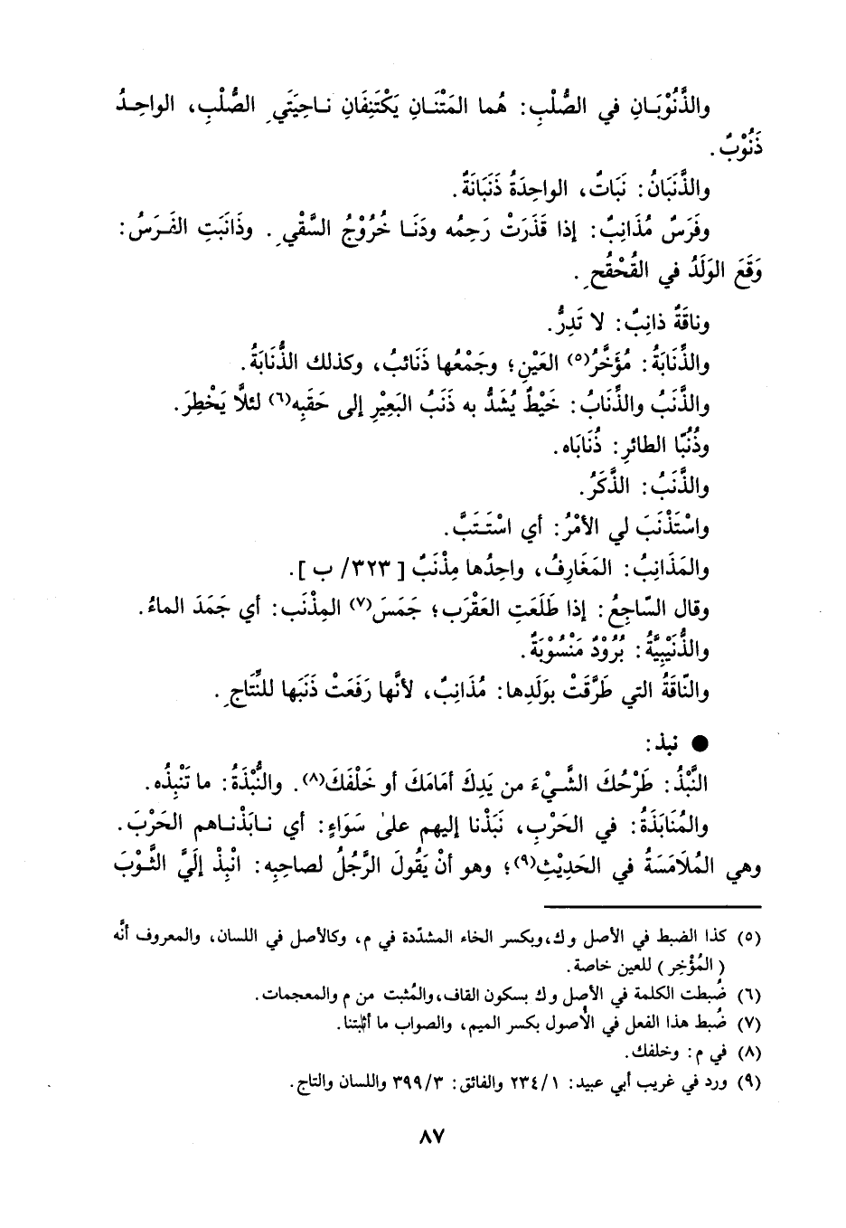 والذَّنُوْبَانِ في الصُّلْبِ : هُما المَتْنَانِ يَكْتَنِفَانِ ناحِيَتَيِ الصُّلْبِ ، الواحِدُ ذَنُوْبٌ . والذَّنَبَانُ : نَبَاتٌ ، الواحِدَةُ ذَنَبَانَةٌ . وفَرَسٌ مُذَانِبٌ : إذا قَذَرَتْ رَحِمُه ودَنَا خُرُوْجُ السَّقْيِ . وذَانَبَتِ الفَرَسُ : وَقَعَ الوَلَدُ في القُحْقُحِ . وناقَةٌ ذانِبٌ : لا تَدِرُّ . والذِّنَابَةُ : مُؤَخَّرُ العَيْنِ ؛ وجَمْعُها ذَنَائبُ ، وكذلك الذُّنَابَةُ . والذَّنَبُ والذِّنَابُ : خَيْطٌ يُشَدُّ به ذَنَبُ البَعِيْرِ إلى حَقَبِه لئلاَّ يَخْطِرَ . وذُنُبّا الطائرِ : ذُنَابَاه . والذَّنَبُ : الذَّكَرُ . واسْتَذْنَبَ لي الأمْرُ : أي اسْتَتَبَّ . والمَذَانِبُ : المَغَارِفُ ، واحِدُها مِذْنَبٌ . وقال السّاجِعُ : إذا ظَلَعَتِ العَقْرَب ؛ جَمَسَ المِذْنَب : أي جَمَدَ الماءُ . والذُّنَيْبِيَّةُ : بُرُوْدٌ مَنْسُوْبَةٌ . والنّاقَةُ التي طَرَّقَتْ بوَلَدِها : مُذَانِبٌ ، لأنَّها رَفَعَتْ ذَنَبَها للنِّتَاجِ . نبذ : النَّبْذُ : طَرْحُكَ الشَّيْءَ من يَدِكَ أمَامَكَ أو خَلْفَكَ . والنُّبْذَةُ : ما تَنْبِذُه . والمُنَابَذَةُ : في الحَرْبِ ، نَبَذْنا إليهم على سَوَاءٍ : أي نابَذْناهم الحَرْبَ . وهي المُلاَمَسَةُ في الحَدِيْثِ ؛ وهو أنْ يَقُولَ الرَّجُلُ لصاحِبِه : انْبِذْ إلَيَّ الثَّوْبَ