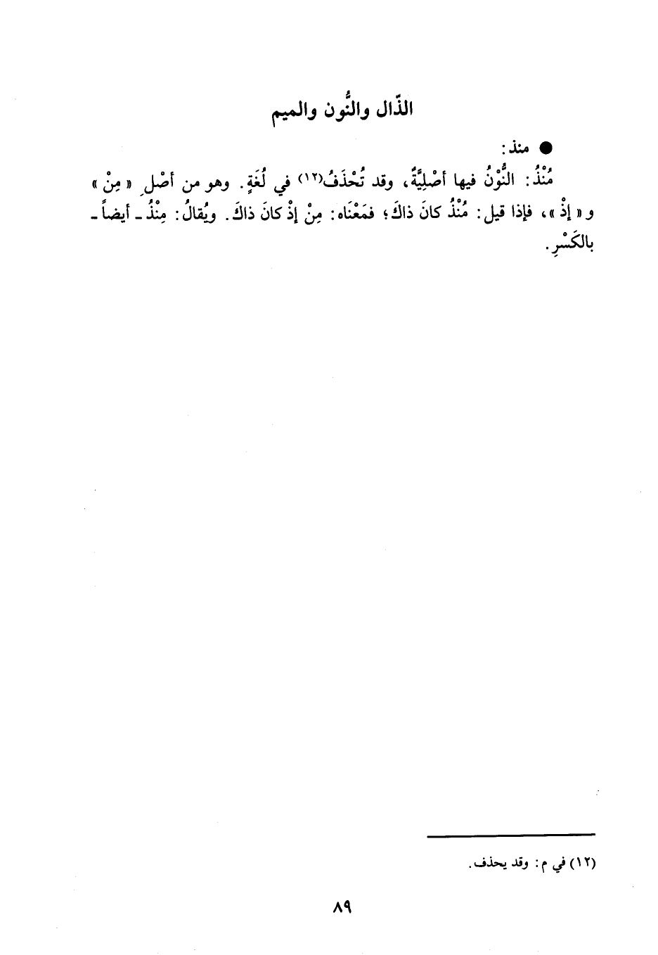 منذ : مُنْذُ : النُّوْنُ فيها أصْلِيَّةٌ ، وقد تُحْذَفُ في لُغَةٍ . وهو من أصْلِ ' مِنْ ' و ' إذْ ' ، فإذا قيل : مُنْذُ كانَ ذاكَ ؛ فمَعْنَاه : مِنْ إذْ كانَ ذاكَ . ويُقالُ : مِنْذُ أيضاً بالكَسْرِ .