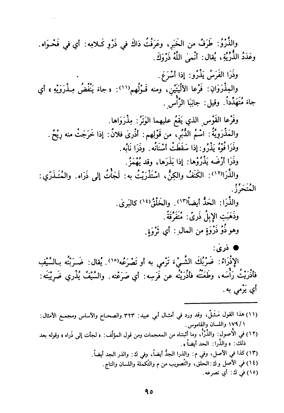 والذَّرْوُ : طَرَفٌ من الخَبَرِ ، وعَرَفْتُ ذاكَ في ذَرْوِ كَلامِه : أي في فَحْوَاه . وعَدَدُ الذُّرِّيَّةِ ، يُقال : أنْمى اللهُ ذَرْوَكَ . وذَرَا الفَرَسُ يَذْرُو : إذا أسْرَعَ . والمِذْرَوَانِ : فَرْعا الألْيَتَيْنِ ، ومنه قَوْلُهم : ' جاءَ يَنْفُضُ مِذْرَوَيْهِ ' أي جاءَ مُتَهَدِّداً . وقيل : جانِبَا الرَّأْسِ . وفَرْعا القَوْسِ الذي يَقَعُ عليهما الوَتَرُ : مِذْرَوَاها . والمَذْرَوِيَّةُ : اسْمُ الدُّبُرِ ، من قَوْلِهم : أذْرى فلانٌ : إذا خَرَجَتْ منه رِيْحٌ . وذَرَا فُوْهُ يَذْرُو : إذا سَقَطَتْ أسْنَانُه . وذَرَا نَابُه . وذَرَا أرْضَه يَذْرُوْها : إذا بَذَرَها ، وقد يُهْمَزُ . والذَّرَا : الكَنَفُ والكِنُّ ، اسْتَذْرَيْتُ به : لَجَأْتُ إلى ذَرَاه . والمُتَذَرّي : المُتَحَرِّزُ . والذَّرَا : الحَدُّ أيضاً . والخَلْقُ كالبَرى . وذَهَبَتِ الإِبِلُ ذَرىً : مُتَفَرِّقَةً . وهو ذُوْ ذَرْوَةٍ من المالِ : أي ثَرْوَةٍ . ذرى : الإِذْرَاءُ : ضَرْبُكَ الشَّيْءَ تَرْمي به أو تَصْرَعُه . يُقال : ضَرَبْتُه بالسَّيْفِ فأذْرَيْتُ رَأْسَه ، وطَعَنْتُه فأذْرَيْتُه عن فَرَسِه : أي صَرَعْته . والسَّيْفُ يُذْري ضَرِيْبَتَه : أي يَرْمي به .