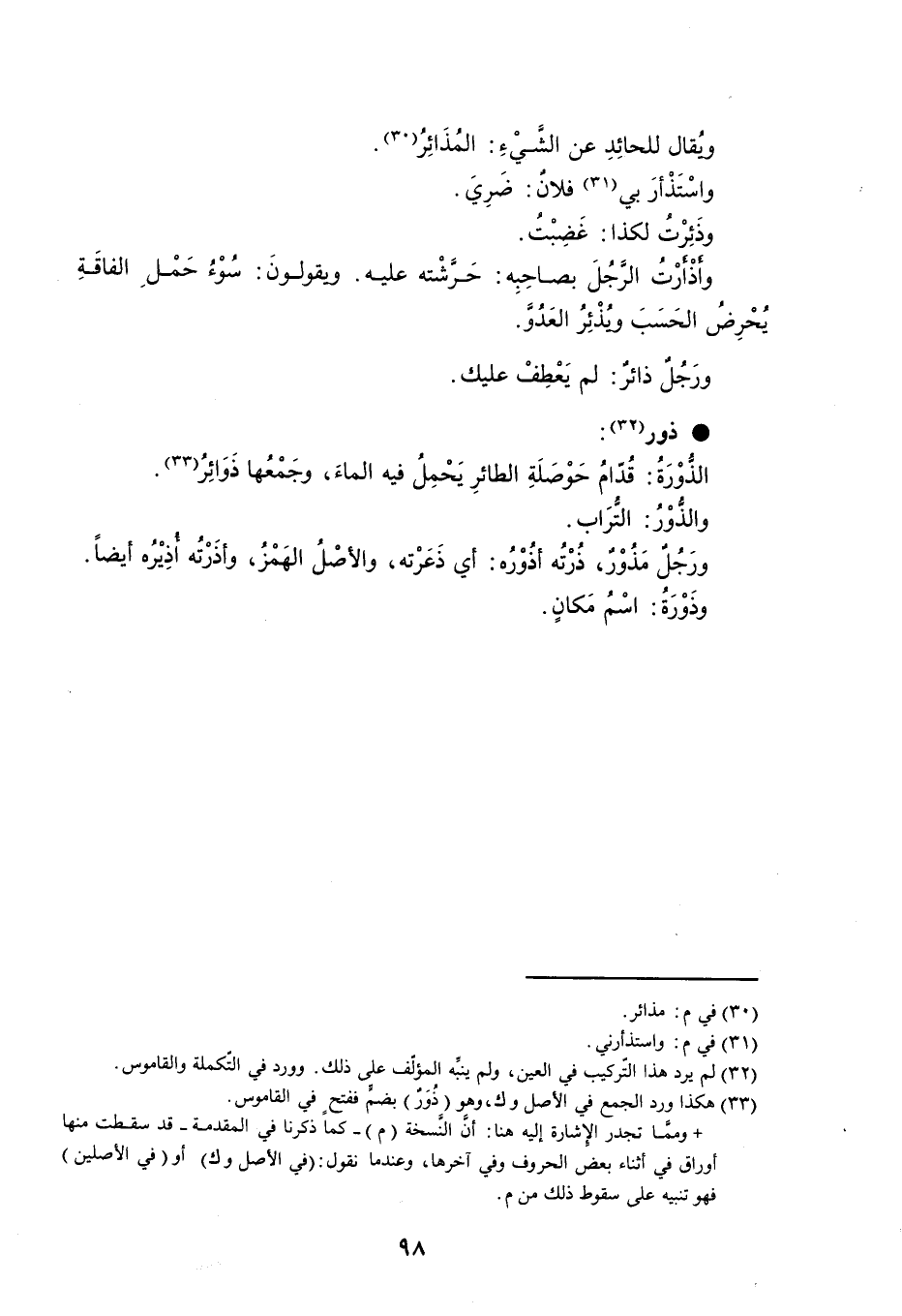 ويُقال للحائِدِ عن الشَّيْءِ : المُذَائِرُ . واسْتَذْأرَ بي فلانٌ : ضَرِيَ . وذَئِرْتُ لكذا : غَضِبْتُ . وأَذْأَرْتُ الرَّجُلَ بصاحِبِه : حَرَّشْته عليه . ويقولونَ : سُوْءُ حَمْلِ الفاقَةِ يُحْرِضُ الحَسَبَ ويُذْئِرُ العَدُوَّ . ورَجُلٌ ذائرٌ : لم يَعْطِفْ عليك . ذور : الذُّوْرَةُ : قُدّامُ حَوْصَلَةِ الطائرِ يَحْمِلُ فيه الماءَ ، وجَمْعُها ذَوَائِرُ . والذُّوْرُ : التُّرَاب . ورَجُلٌ مَذُوْرٌ ، ذُرْتُه أذُوْرُه : أي ذَعَرْته ، والأصْلُ الهَمْزُ ، وأذَرْتُه أُذِيْرُه أيضاً . وذَوْرَةُ : اسْمُ مَكانٍ .