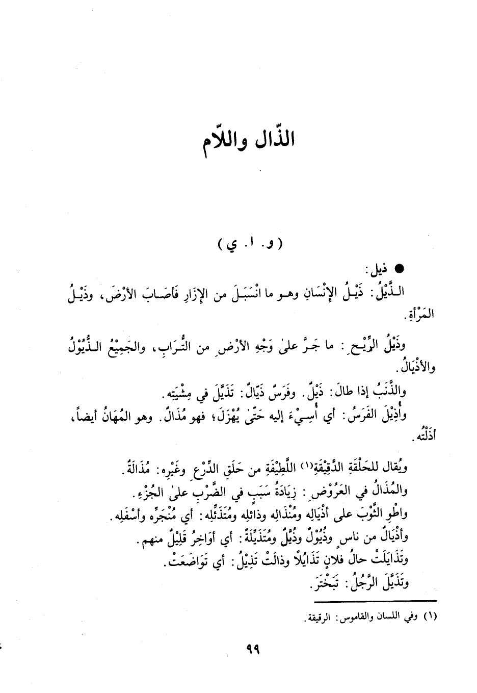ذيل : الذَّيْلُ : ذَيْلُ الإِنْسَانِ وهو ما انْسَبَلَ من الإِزَارِ فَأصَابَ الأرْضَ ، وذَيْلُ المَرْأةِ . وذَيْلُ الرِّيْح : ما جَرَّ على وَجْهِ الأرْضِ من التُّرَابِ ، والجَمِيْعُ الذُّيُوْلُ والأذْيَالُ . والذَّنَبُ إذا طالَ : ذَيْلٌ . وفَرَسٌ ذَيّالٌ : تَذَيَّلَ في مِشْيَتِه . وأُذِيْلَ الفَرَسُ : أي أُسِيْءَ إليه حَتّى يُهْزَلَ ؛ فهو مُذَالٌ . وهو المُهَانُ أيضاً ، أذَلْتُه . ويُقال للحَلْقَةِ الدَّقِيْقَةِ اللَّطِيْفَةِ من حَلَقِ الدِّرْعِ وغَيْرِه : مُذَالَةٌ . والمُذَالُ في العَرُوْضِ : زِيَادَةُ سَبَبٍ في الضَّرْبِ على الجُزْءِ . واطْوِ الثَّوْبَ على أذْيَالِه ومُنْذَالِه وذائلِه ومُتَذَئِّلِه : أي مُنْجَرِّه وأسْفَلِه . وأذْيَالٌ من ناسٍ وذُيُوْلٌ وذُيَّلٌ ومُتَذَيِّلَةٌ : أي أوَاخِرُ قَلِيْلٌ منهم . وتَذَايَلَتْ حالُ فلانٍ تَذَايُلاً وذالَتْ تَذِيْلُ : أي تَوَاضَعَتْ . وتَذَيَّلَ الرَّجُلُ : تَبَخْتَرَ .