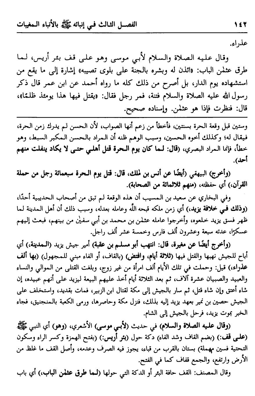 وقال عليه الصلاة والسلام لأبي موسى وهو على قف بئر أريس، لما طرق عثمان الباب: "ائذن له وبشره بالجنة على بلوى تصيبه" إشارة إلى ما يقع من استشهاده يوم الدار، بل أصرح من ذلك كله ما رواه أحمد عن ابن عمر قال ذكر رسول الله عليه الصلاة والسلام فتنة، فمر رجل فقال: "يقتل فيها هذا يومئذ ظلما". قال: فنظرت فإذا هو عثمان. وإسناده صحيح.
