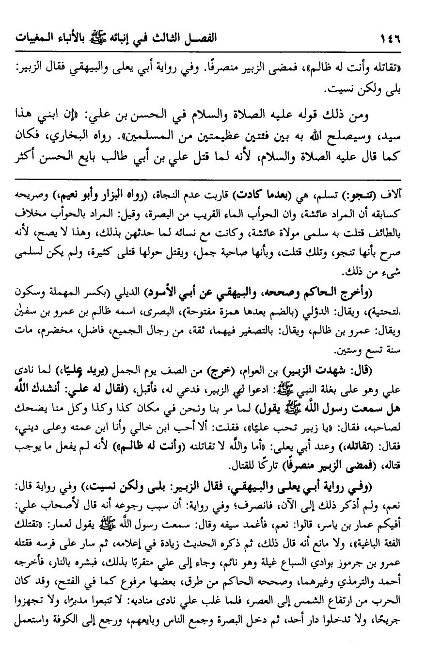 "وفي رواية أبي يعلى والبيهقي، فقال الزير: بلى ولكن نسيت", وفي رواية قال: نعم، ولم أذكر ذلك إلا الآن، فانصرف، وفي رواية: أن سبب رجوعه أنه قال لأصحاب علي: أفيكم عمار بن ياسر، قالوا: نعم، فأغمد سيفه وقال: سمعت رسول الله صلى الله عليه وسلم يقول لعمار: "تقتلك الفئة الباغية". ولا مانع أنه قال ذلك، ثم ذكره الحديث زيادة في إعلامه، ثم سار على فرسه فقتله عمرو بن جرموز بوادي السباع غيلة وهو نائم وجاء إلى علي متقربا بذلك، فبشره بالنار، فأخرجه أحمد والترمذي وغيرهما، وصححه الحاكم من طرق، بعضها مرفوع كما في الفتح، وقد كانت الحرب من ارتفاع الشمس إلى العصر، فلما غلب علي نادى مناديه: لا تتبعوا مدبرا، ولا تجهزوا جريحا، ولا تدخلوا دار أحد، ثم دخل البصرة وجمع الناس وبايعهم، ورجع إلى الكوفة واستعمل