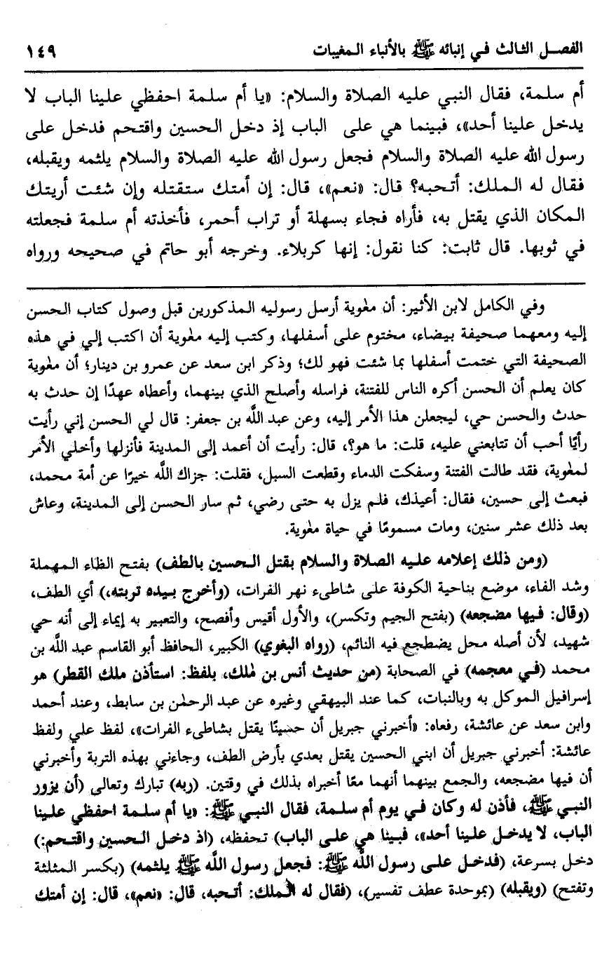 أم سلمة، فقال النبي عليه الصلاة والسلام: "يا أم سلمة احفظي علينا الباب لا يدخل علينا أحد". فبينما هي على الباب إذ دخل الحسين واقتحم فدخل على رسول الله عليه الصلاة والسلام فجعل رسول الله عليه الصلاة والسلام يلثمه ويقبله، فقال له الملك، أتحبه؟ قال: "نعم"، قال: إن أمتك ستقتله وإن شئت أريتك المكان الذي يقتل به، فأراه فجاء بسهلة أو تراب أحمر، فأخذته أم سلمة فجعلته في ثوبها. قال ثابت: كنا نقول: إنها كربلاء. وخرجه أبو حاتم في صحيحه ورواه