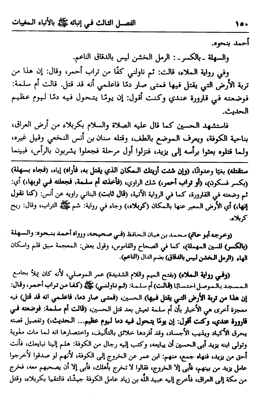 "وفي رواية الملاء"، "بفتح الميم واللام الشديدة" عمر الموصلي، لأنه كان يملأ بجامع المسجد بالموصل احتسابا "قالت" أم سلمة: "ثم ناولني"، "كفا من تراب أحمر، وقال: "إن هذا من تربة الأرض التي يقتل فيها" الحسين، "فمتى صار دما، فاعلمي أنه قد قتل" فيه معجزة أخرى هي الإخبار بأن أم سلمة تعيش بعد قتل الحسين، "قالت أم سلمة: فوضعته في قارورة عندي، وكنت أقول: إن يوما يتحول فيه دما ليوم عظيم. الحديث" وتفصيل قصته يحرق الأكباد ويذيب الأجساد، وقد أفردها خلائق بالتأليف، واختصارها أنه لما مات معاوية تولى ابنه يزيد أبى الحسين أن يبايعه، وكتب إليه رجال من الكوفة: هلم إلينا نبايعك، فأنت أحق من يزيد، فنهاه جمع, منهم: ابن عمر عن الخروج إلى الكوفة، لأنهم لو صدقوا لأخرجوا عامل يزيد من بينهم، فأبى إلا الخروج، فقالوا لا تخرج بأهلك، فأبى إلا أن يصحبهم معه، فخرج من مكة إلى العراق، فأخرج إليه عبيد الله بن زياد عامل الكوفة جيشا، فالتقيا بكربلاء، وقتل