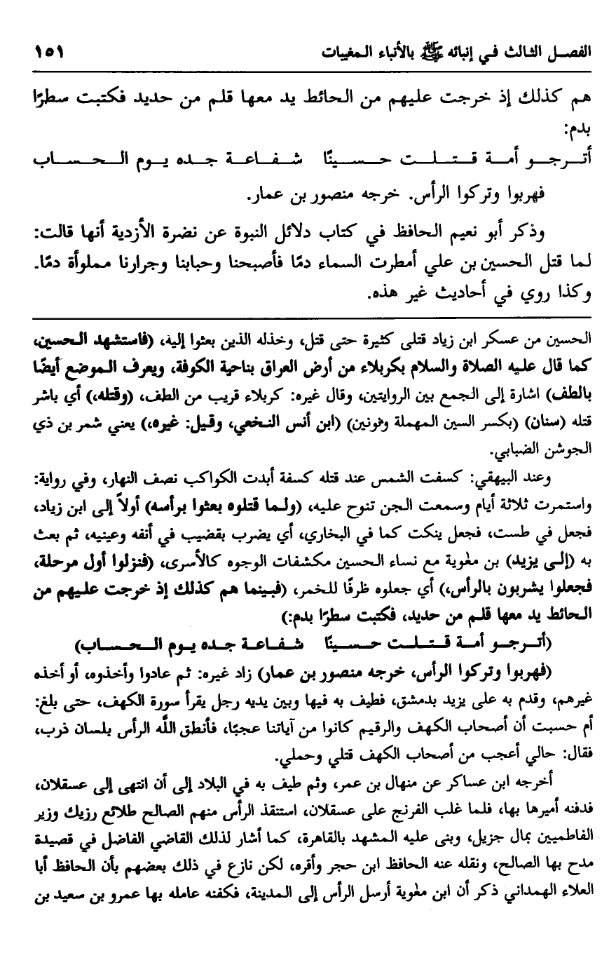 وذكر أبو نعيم الحافظ في كتاب دلائل النبوة عن نضرة الأزدية أنها قالت: لما قتل الحسين بن علي أمطرت السماء دما فأصبحنا وحبابنا وجرارنا مملوءة دما, وكذا روي في أحاديث غير هذه.