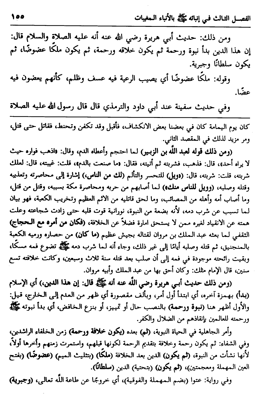 ومن ذلك: حديث أبي هريرة رضي الله عنه أنه عليه الصلاة والسلام قال: "إن هذا الدين بدأ نبوة ورحمة ثم يكون خلافة ورحمة، ثم يكون ملكا عضوضا، ثم يكون سلطانا وجبرية".