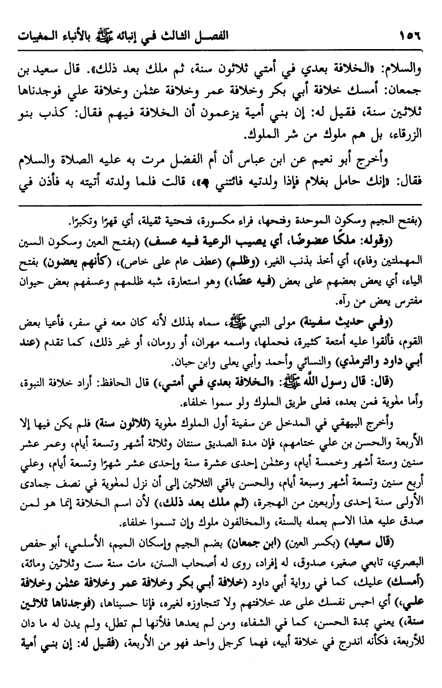 والسلام: "الخلافة بعدي في أمتي ثلاثون سنة، ثم ملك بعد ذلك" قال سعيد بن جمعان: أمسك خلافة أبي بكر وخلافة عمر وخلافة عثمان وخلافة علي فوجدناها ثلاثين سنة، فقيل له: إن بني أمية يزعمون أن الخلافة فيهم فقال: كذب بنو الزرقاء، بل هم ملوك من شر الملوك.