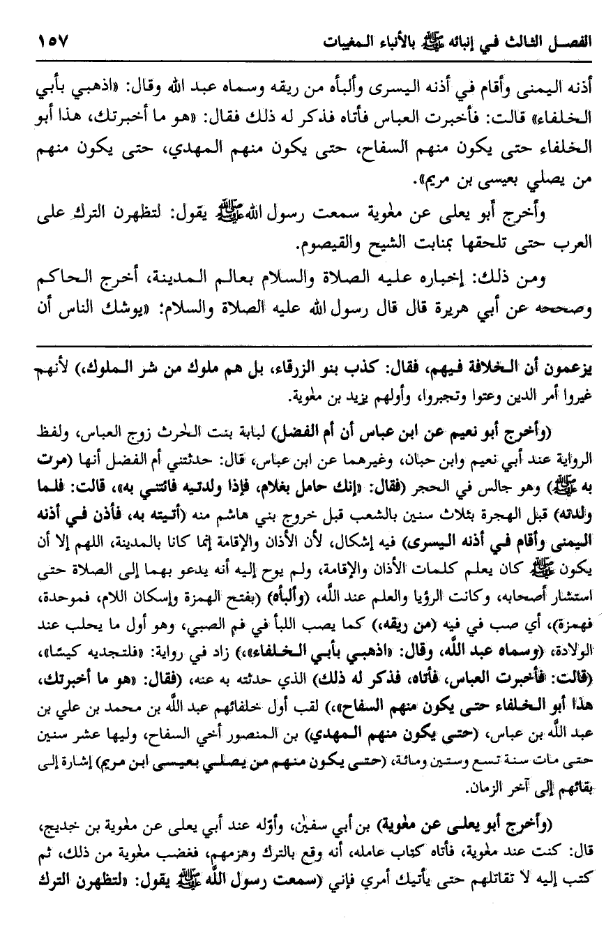 أذنه اليمنى وأقام في أذنه اليسرى وألبأه من ريقه وسماه عبد الله وقال: "اذهبي بأبي الخلفاء" قالت: فأخبرت العباس, فأتاه فذكر له ذلك فقال: "هو ما أخبرتك، هذا أبو الخلفاء حتى يكون منهم السفاح، حتى يكون منهم المهدي، حتى يكون منهم من يصلي بعيسى ابن مريم".