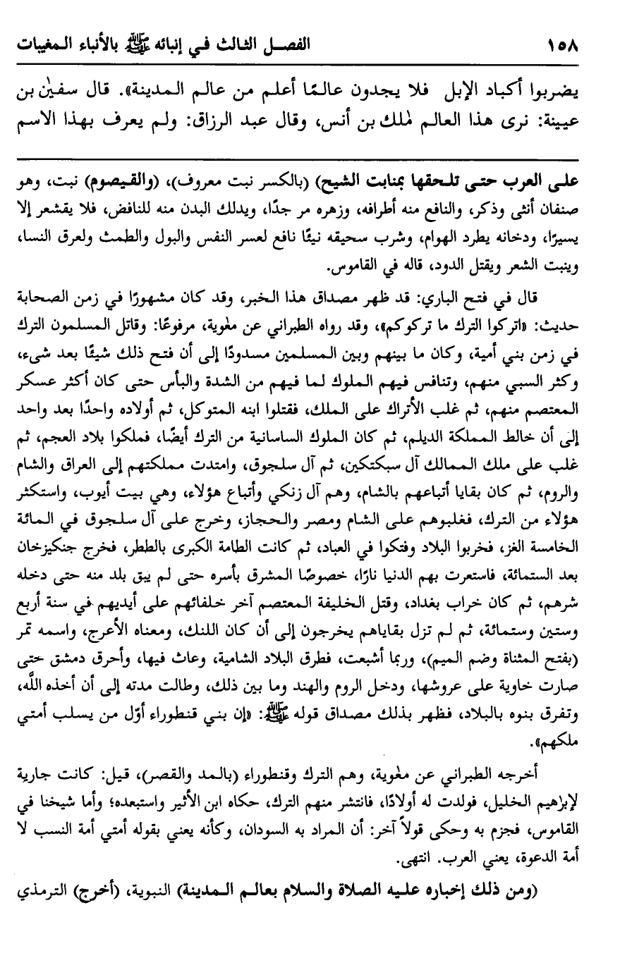 قال في فتح الباري: قد ظهر مصداق هذا الخبر، وقد كان مشهورا في زمن الصحابة حديث: "اتركوا الترك ما تركوكم" وقد رواه الطبراني عن معاوية، مرفوعا وقاتل المسلمون الترك في زمن بني أمية، وكان ما بينهم وبين المسلمين مسدود إلى أن فتح ذلك شيئا بعد شيء، وكثر السبي منهم، وتنافس فيهم الملوك لما فيهم من الشدة والبأس حتى كان أكثر عسكر المعتصم منهم، ثم غلب الأتراك على الملك، فقتلوا ابنه المتوكل، ثم أولاده واحدا بعد واحد إلى أن خالط المملكة الديلم، ثم كان الملوك الساسانية من الترك أيضا، فملكوا بلاد العجم، ثم غلب على ملك الممالك آل سبكتكين، ثم آل سلجوق، وامتدت مملكتهم إلى العراق والشام والروم، ثم كان بقايا أتباعهم بالشام، وهم آل زنكي وأتباع هؤلاء وهي بيت أيوب، واستكثر هؤلاء من الترك، فغلبوهم على الشام ومصر والحجاز، وخرج على آل سلجوق في المائة الخامسة الغز، فخربوا البلاد وفتكوا في العباد، ثم كانت الطامة الكبرى بالططر، فخرج جنكيزخان بعد الستمائة، فاستعرت بهم الدنيا نارا، خصوصا المشرق بأسره حتى لم يبق بلد منه حتى دخله شرهم، ثم كان خراب بغداد، وقتل الخليفة المعتصم آخر خلفائهم على أيديهم في سنة أربع وستين وستمائة، ثم لم تزل بقايهم يخرجون إلى أن كان اللنك، ومعناه الأعرج، واسمه تمر "بفتح المثناة وضم الميم" وربما أشبعت، فطرق البلاد الشامية، وعاث فيها، وأحرق دمشق حتى صارت خاوية على عروشها، ودخل الروم والهند وما بين ذلك، وطالت مدته إلى أن أخذه الله، وتفرق بنوه بالبلاد، فظهر بذلك مصداق قوله صلى الله عليه وسلم: "إن بني قنطوراء أول من يسلب أمتي ملكهم".