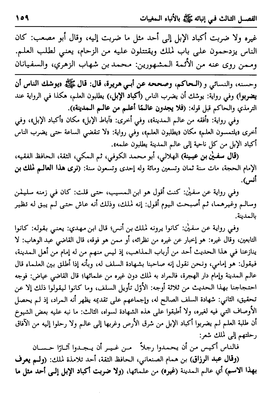 وحسنه، والنسائي و"الحاكم، وصححه عن أبي هريرة، قال: قال صلى الله عليه وسلم "يوشك الناس أن يضربوا" وفي رواية: "يوشك أن يضرب الناس". "أكباد الإبل" يطلبون العلم، هكذا في الرواية عند الترمذي والحاكم قبل قوله: "فلا يجدون عالما أعلم من عالم المدينة".