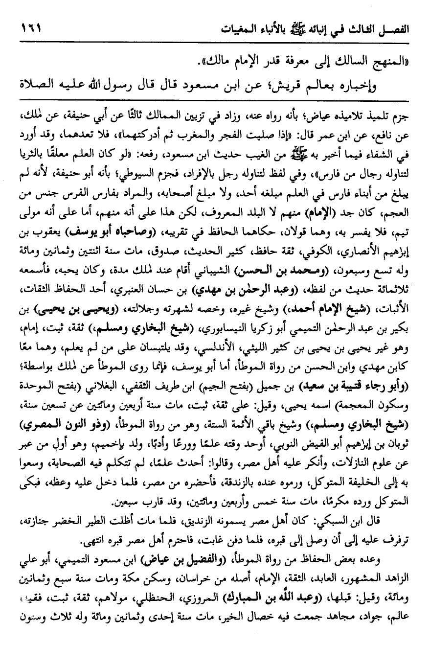 جزم تلميذ تلاميذه عياض، بأنه رواه عنه، وزاد في تزيين الممالك ثالثا عن أبي حنيفة، عن مالك، عن نافع، عن ابن عمر قال: "إذا صليت الفجر والمغرب ثم أدركتهما" فلا تعدهما، وقد أورد في الشفاء فيما أخبر به صلى الله عليه وسلم من الغيب حديث ابن مسعود، رفعه: "لو كان العلم معلقا بالثريا لتناوله رجال من فارس". وفي لفظ: لتناوله رجل بالإفراد، فجزم السيوطي، بأنه أبو حنيفة، لأنه لم يبلغ من أبناء فارس في العلم مبلغه أحد، ولا مبلغ أصحابه، والمراد بفارس الفرس جنس من العجم، كان جد "الإمام" منهم لا البلد المعروف، لكن هذا على أنه منهم، أما على أنه مولى تيم، فلا يفسر به، وهما قولان، حكاهما الحافظ في تقريبه، "وصاحباه أبو يوسف" يعقوب بن إبراهيم الأنصاري، الكوفي، ثقة حافظ، كثير الحديث، صدوق، مات سنة اثنتين وثمانين ومائة وله تسع وسبعون، "ومحمد بن الحسن" الشيباني أقام عند مالك مدة، وكان يحبه، فأسمعه ثلاثمائة حديث من لفظه، "وعبد الرحمن بن مهدي" بن حسان العنبري، أحد الحفاظ الثقات، الأثبات، "شيخ الإمام أحمد" وشخ غيره، وخصه لشهرته وجلالته، "ويحيى بن يحيى" بن بكير بن عبد الرحمن التميمي أبو زكريا النيسابوري، "شيخ البخاري ومسلم" ثقة، ثبت إمام، وهو غير يحيى بن يحيى بن كثير الليثي، الأندلسي, وقد يلتبسان على من لم يعلم، وهما معا كابن مهدي وابن الحسن من رواة الموطأ، أما أبو يوسف، فإنما روى الموطأ عن مالك بواسطة، "وأبو رجاء قتيبة بن سعيد" بن جميل "بفتح الجيم" ابن طريف الثقفي، البغلاني "بفتح الموحدة وسكون المعجمة" اسمه يحيى، وقيل: علي. ثقة، ثبت، مات سنة أربعين ومائتين عن تسعين سنة، "شيخ البخاري ومسلم" وشيخ باقي الأئمة الستة، وهو من رواة الموطأ، "وذو النون المصري" ثوبان بن إبراهيم أبو الفيض النوبي، أوحد وقته علما وورعا وأدبا، ولد بإخميم، وهو أول من عبر عن علوم النازلات، وأنكر عليه أهل مصر، وقالوا: أحدث علما، لم تتكلم فيه الصحابة، وسعوا به إلى الخليفة المتوكل، ورموه عنده بالزندقة، فأحضره من مصر، فلما دخل عليه وعظه، فبكى المتوكل ورده مكرما، مات سنة خمس وأربعين ومائتين، وقد قارب سبعين.