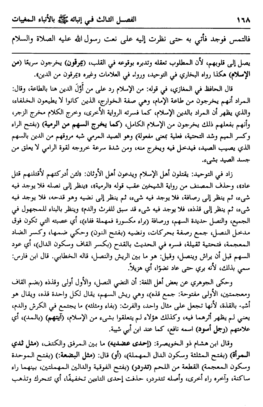 زاد في التوحيد: يقتلون أهل الإسلام ويدعون أهل الأوثان: "لئن أدركتهم لأقتلنهم قتل عاد"، وحذف المصنف من رواية الشيخين عقب قوله: "الرمية". "ينظر إلى نصله فلا يوجد فيه شيء، ثم ينظر إلى رصافة، فلا يوجد فيه شيء، ثم ينظر إلى نضيه وهو قدحه، لا يوجد فيه شيء، ثم ينطر إلى قذذه، فلا يوجد فيه شيء قد سبق للفرث والدم" وينظر بالبناء للمجهول في الجميع، والنصل حديدة السهم، ورصافة "براء مكسورة فمهملة ففاء"، أي عصبته التي تكون فوق مدخل النصل، جمع رصفة بحركات، ونضيه "بفتح النون" وحكي ضمها، وكسر الضاد المعجمة، فتحتية ثقيلة، فسره في الحديث بالقدح "بكسر القاف وسكون الدال"، أي عود السهم قبل أن يراش وينصل، وقيل: هو ما بين الريش والنصل، قاله الخطابي. قال ابن فارس: سمي بذلك لأنه بري حتى عاد نضوا، أي هزيلا.