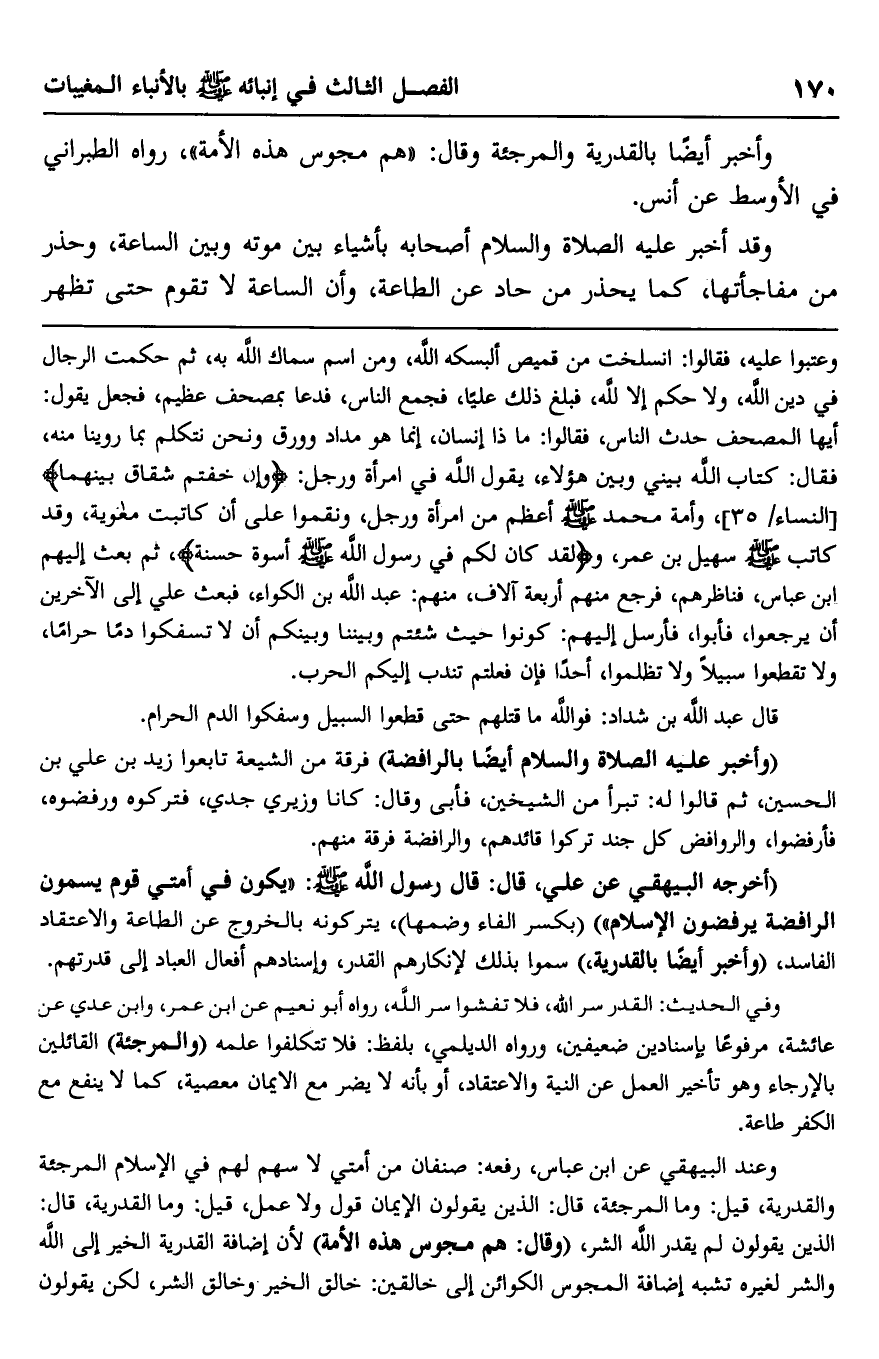 وأخبر أيضا بالقدرية والمرجئة وقال: "هم مجوس هذه الأمة"، رواه الطبراني في الأوسط عن أنس.