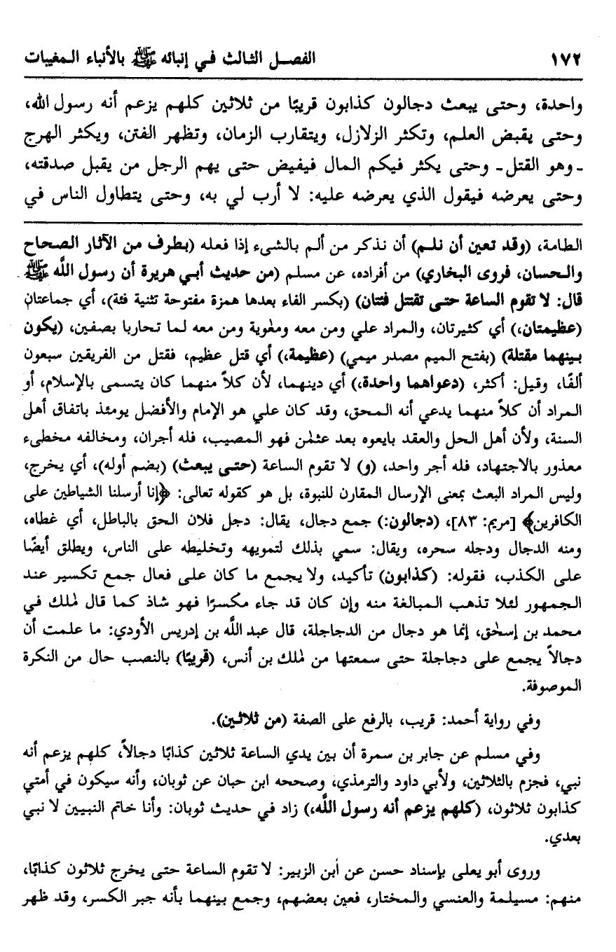 وفي مسلم عن جابر بن سمرة أن بين يدي الساعة ثلاثين كذابا دجالا، كلهم يزعم أنه نبي، فجزم بالثلاثين، ولأبي داود والترمذي، وصححه ابن حبان عن ثوبان: "وأنه سيكون في أمتي كذابون ثلاثون". "كلهم يزعم أنه رسول الله" زاد في حديث ثوبان: "وأنا خاتم النبيين لا نبي بعدي".