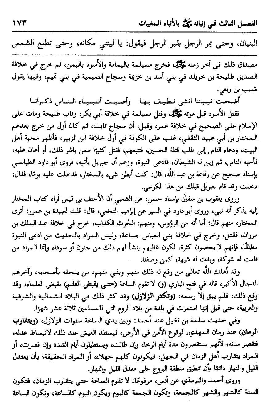مصداق ذلك في آخر زمنه صلى الله عليه وسلم فخرج مسيلمة باليمامة, والأسود باليمن, ثم خرج في خلاف الصديق طليحة بن خويلد في بني أسد بن خزيمة وسجاح التميمية في بني تميم، وفيها يقول شبيب بن ربعي: