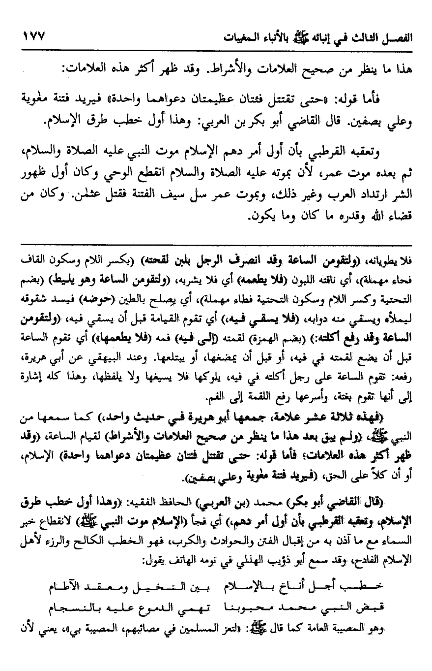 "قال القاضي أبو بكر" محمد "بن العربي" الحافظ الفقيه: "وهذا أول خطب طرق الإسلام، وتعقبه القرطبي بأن أول أمر دهم" أي فجأ "الإسلام موت النبي صلى الله عليه وسلم" لانقطاع خبر السماء مع ما آذن به من إقبال الفتن والحوادث والكرب، فهو الخطب الكالح والرزء لأهل الإسلام الفادح، وقد سمع أبو ذؤيب الهذلي في نومه الهاتف يقول: