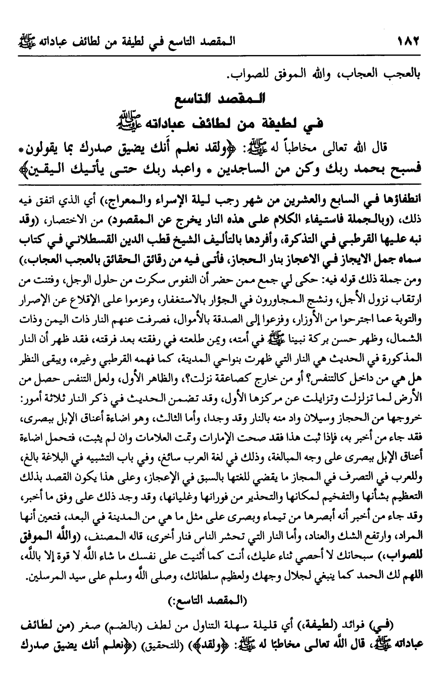 انطفاؤها في السابع والعشرين من شهر رجب ليلة الإسراء والمعراج" أي الذي اتفق فيه ذلك، "وبالجملة فاستيفاء الكلام على هذه النار يخرج عن المقصود" من الاختصار. "وقد نبه عليه القرطبي في التذكرة، وأفردها بالتأليف الشيخ قطب الدين القسطلاني في كتاب سماه جمل الإيجاز بنار الحجاز، فأتى فيه من رقائق الحقائق بالعجب العجاب", ومن جملة ذلك قوله فيه: حكى لي جمع ممن حضر أن النفوس سكرت من حلول الوجل، وفتنت من ارتقاب نزول الأجل، ونشج المجاورون في الجؤار بالاستغفار، وعزموا على الإقلاع عن الإصرار والتوبة عما اجترحوا من الأوزار، وفزعوا إلى الصدقة بالأموال، فصرفت عنهم النار ذات اليمين وذات الشمال، وظهر حسن بركة نبينا صلى الله عليه وسلم في أمته، ويمن طلعته في رفقته بعد فرقته، فقد ظهر أن النار المذكورة في الحديث هي النار التي ظهرت بنواحي المدينة، كما فهمه القرطبي وغيره، ويبقى النظر هل هي من داخل كالتنفس؟ أو من خارج كصاعقة نزلت؟ والظاهر الأول، ولعل التنفس حصل من الأرض لما تزلزلت وتزايلت عن مركزها الأول، وقد تضمن الحديث في ذكر النار ثلاثة أمور: خروجها من الحجاز وسيلان واد منه بالنار وقد وجدا، وأما الثالث، وهو إضاءة أعناق الإبل ببصرى، فقد جاء من أخبر به، فإذا ثبت هذا فقد صحت الأمارات وتمت العلامات وإن لم يثبت، فتحمل إضاءة أعناق الإبل ببصرى على وجه المبالغة، وذلك في لغة العرب سائغ، وفي باب التشبيه في البلاغة بالغ، وللعرب في التصرف في المجاز ما يقضي للغتها بالسبق في الإعجاز، وعلى هذا يكون القصد بذلك التعظيم بشأنها والتفخيم لمكانها والتحذير من فورانها وغليانها، وقد وجد ذلك على وفق ما أخبر، وقد جاء من أخبر أنه أبصرها من تيماء وبصرى على مثل ما هي من المدينة في البعد، فتعين أنها المراد، وارتفع الشك والعناد، وأما النار التي تحشر الناس فنار أخرى، قاله المصنف، "والله الموفق للصواب" سبحانك لا أحصي ثناء عليك، أنت كما أثنيت على نفسك ما شاء الله لا قوة إلا بالله، اللهم لك الحمد كما ينبغي لجلال وجهك ولعظيم سلطانك، وصلى الله وسلم على سيد المرسلين.
