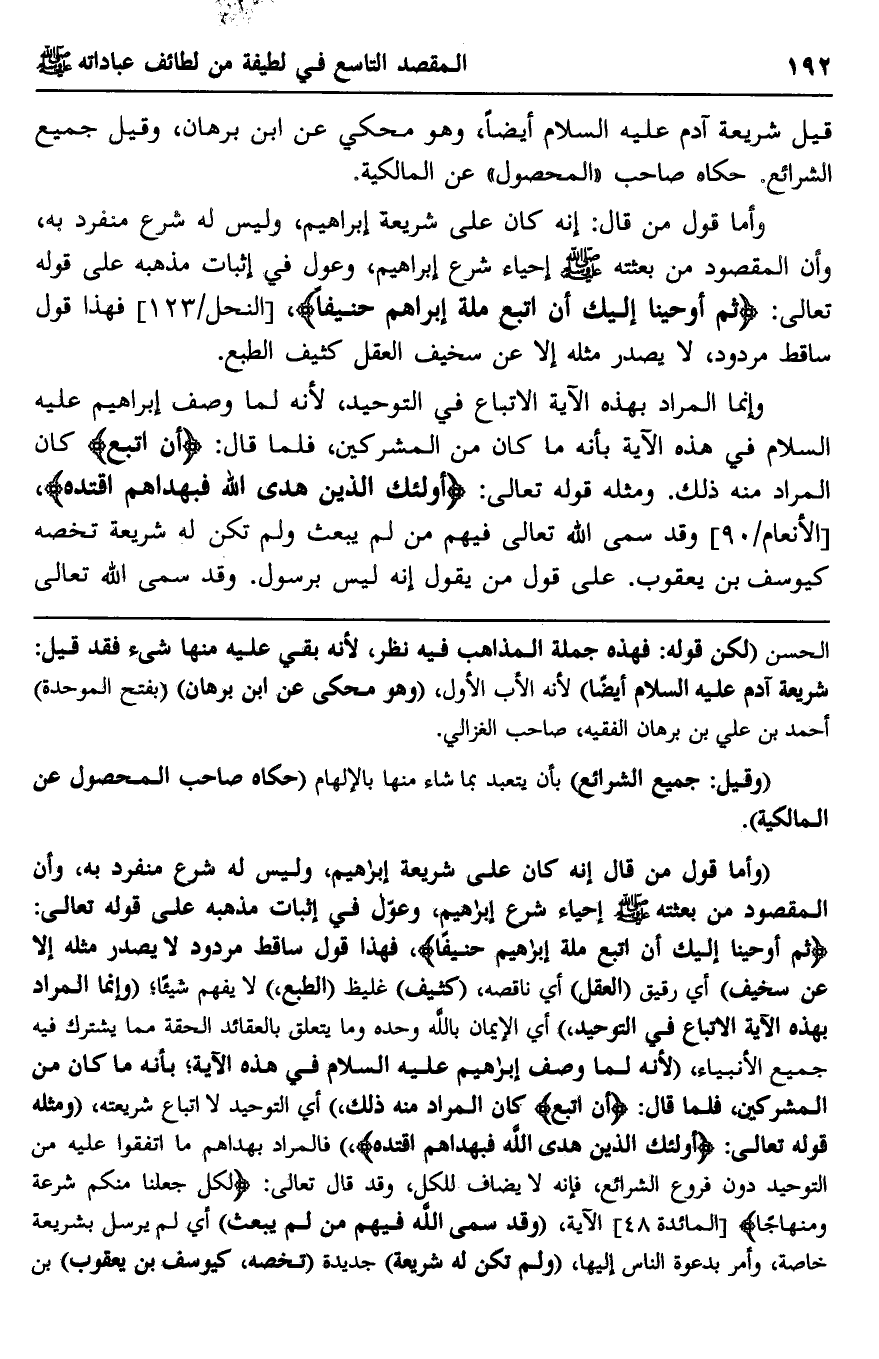 "وأما قول من قال إنه كان على شريعة إبراهيم، وليس له شرع منفرد به، وأن المقصود من بعثته صلى الله عليه وسلم إحياء شرع إبراهيم، وعول في إثبات مذهبه على قوله تعالى: {ثُمَّ أَوْحَينَا إِلَيْكَ أَنِ اتَّبِعْ مِلَّةَ إِبْرَاهِيمَ حَنِيفًا} ، فهذا قول ساقط مردود لا يصدر مثله إلا عن سخيف" أي رقيق "العقل" أي ناقصه، "كثيف" غليظ "الطبع" لا يفهم شيئا، "وإنما المراد بهذه الآية الاتباع في التوحيد" أي الإيمان بالله وحده وما يتعلق بالعقائد الحقة مما يشترك فيه جميع الأنبياء "لأنه لما وصف إبراهيم عليه السلام في هذه الآية، بأنه ما كان من المشركين، "فلما قال: {أَنِ اتَّبِعْ} كان المراد منه ذلك،" أي التوحيد لا اتباع شريعته، "ومثله قوله تعالى: {أُولَئِكَ الَّذِينَ هَدَى اللَّهُ فَبِهُدَاهُمُ اقْتَدِهْ} فالمراد بهداهم ما اتفقوا عليه من التوحيد دون فروع الشرائع، فإنه لا يضاف للكل، وقد قال تعالى: {لِكُلٍّ جَعَلْنَا مِنْكُمْ شِرْعَةً وَمِنْهَاجًا} [المائدة: 48] الآية، "وقد سمى الله فيهم من لم يبعث" أي لم يرسل بشريعة خاصة، وأمر بدعوة الناس إليها، "ولم تكن له شريعة" جديدة "تخصه، كيوسف بن يعقوب" بن