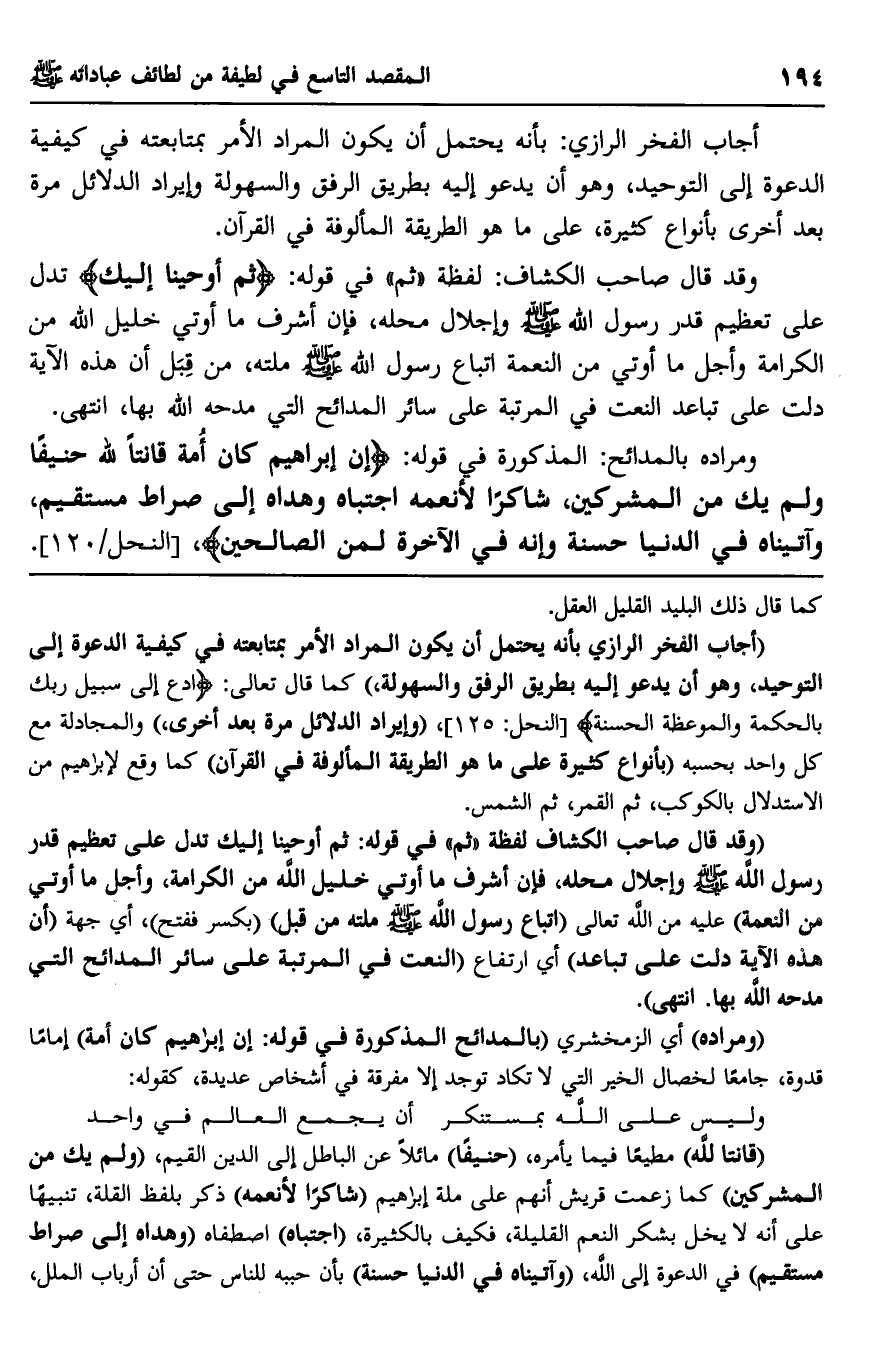 "وقد قال صاحب الكشاف لفظة "ثم" في قوله: {ثُمَّ أَوْحَيْنَا إِلَيْكَ} تدل على تعظيم قدر رسول الله صلى الله عليه وسلم وإجلال محله، فإن أشرف ما أوتي خليل الله من الكرامة، وأجل ما أوتي من النعمة" عليه من الله تعالى "اتباع رسول الله صلى الله عليه وسلم ملته من قِبَل"، "بكسر ففتح" أي جهة "أن هذه الآية دلت على تباعد" أي ارتفاع "النعت في المرتبة على سائر المدائح التي مدحه الله بها. انتهى".