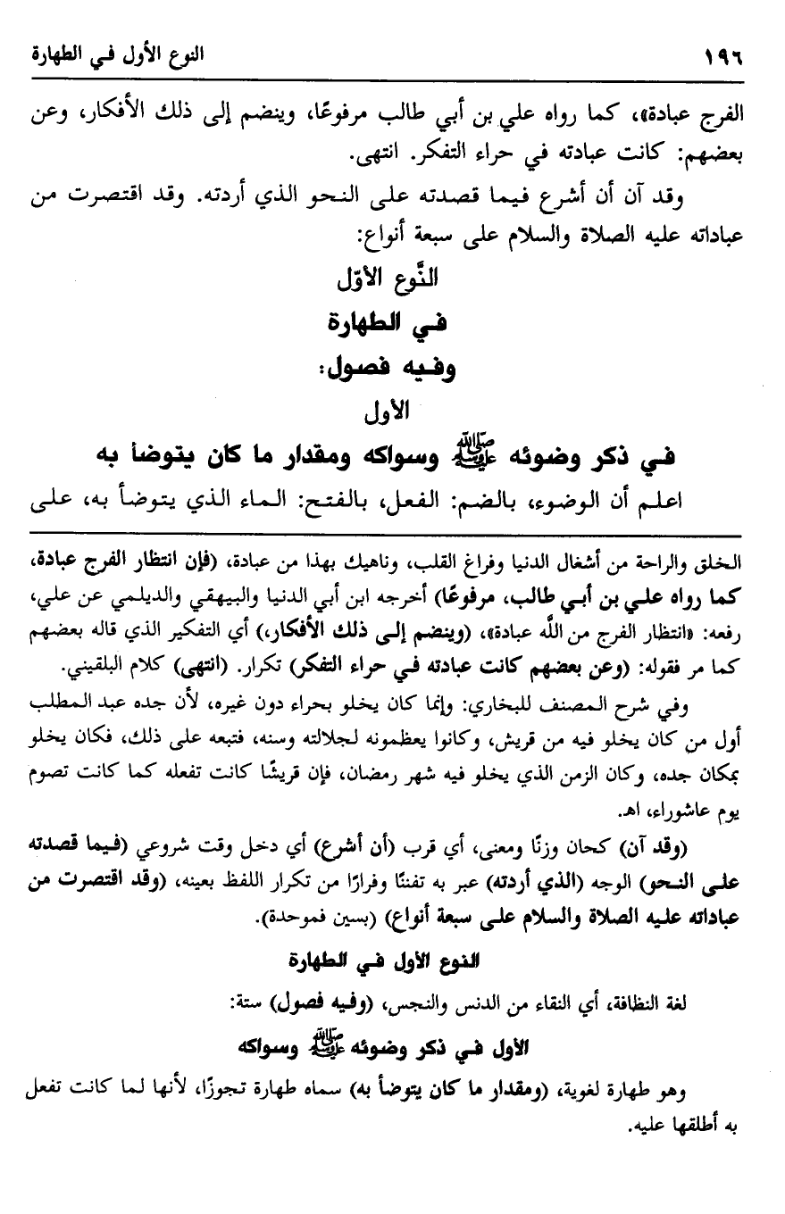 الفرج عبادة" كما رواه علي بن أبي طالب مرفوعا، وينضم إلى ذلك الأفكار، وعن بعضهم: كانت عبادته في حراء التفكر. انتهى.