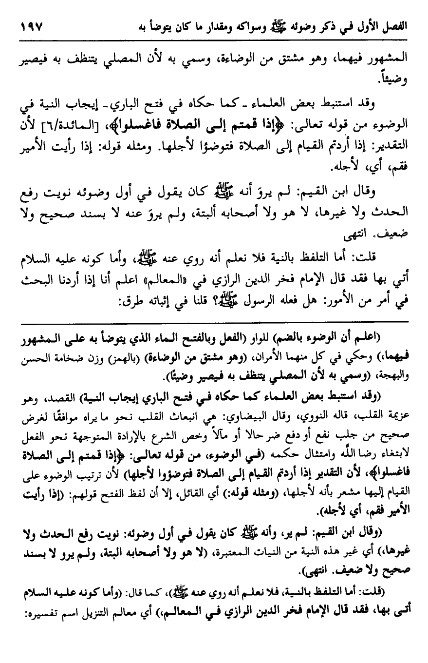 "قلت: أما التلفظ بالنية، فلا نعلم أنه روي عنه صلى الله عليه وسلم"، كما قال: "وأما كونه عليه السلام أتى بها، فقد قال الإمام فخر الدين الرازي في المعالم" أي معالم التنزيل اسم تفسيره: