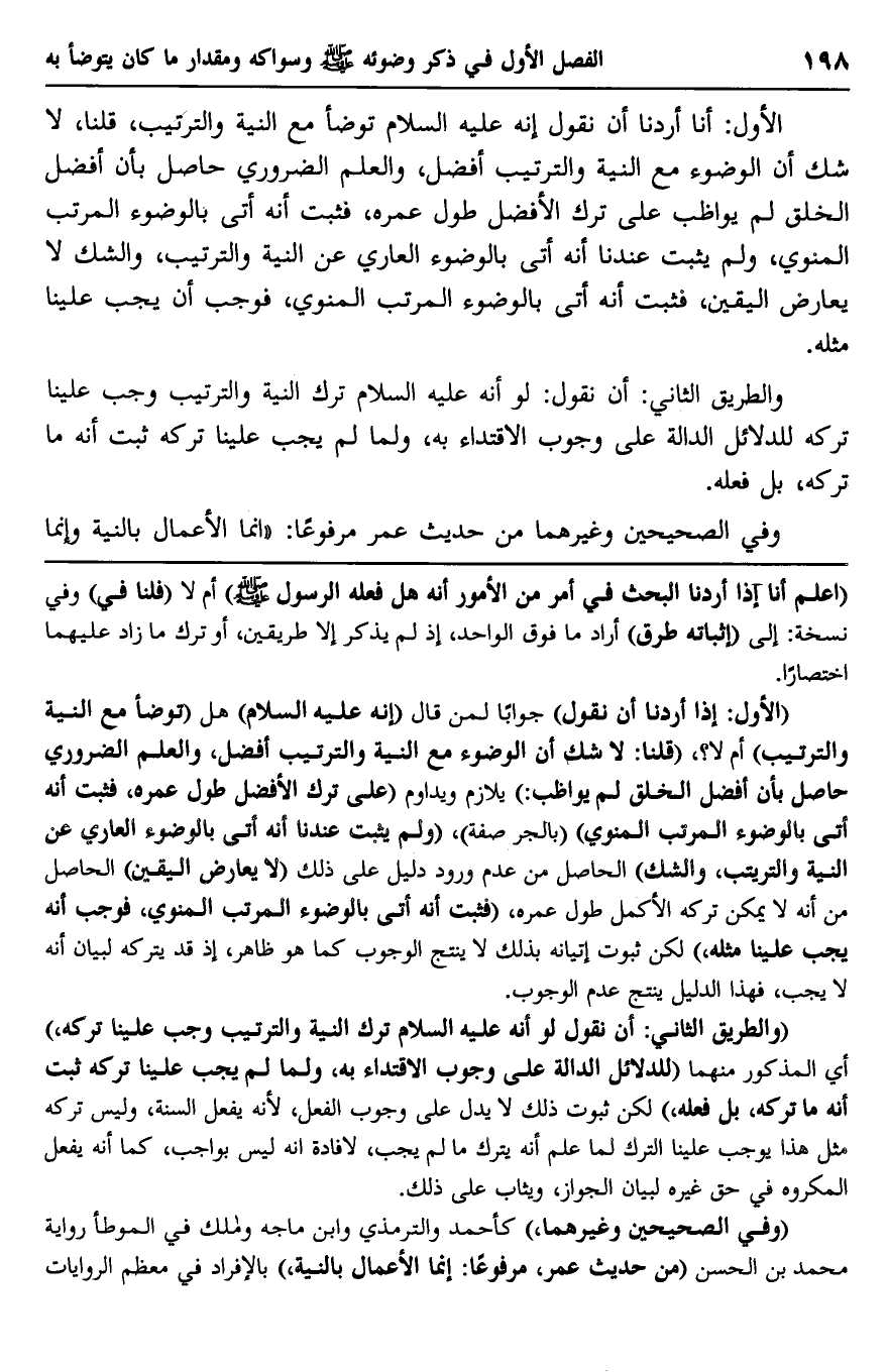"الأول: إذا أردنا أن نقول" جوابا لمن قال "إنه عليه السلام" له "توضأ مع النية والترتيب أم لا؟ "قلنا: لا شك أن الوضوء مع النية والترتيب أفضل، والعلم الضروري حاصل بأن أفضل الخلق لم يواظب" يلازم ويدوام "على ترك الأفضل طول عمره، فثبت أنه أتى بالوضوء المرتب المنوي" بالجر صفة"، "ولم يثبت عندنا أنه أتى بالوضوء العاري عن النية والترتيب والشك" الحاصل من عدم ورود دليل على ذلك "لا يعارض اليقين" الحاصل من أنه لا يمكن تركه الأكمل طول عمره، "فثبت أنه أتى بالوضوء المرتب المنوي، فوجب أنه يجب علينا مثله" لكن ثبوت إتيانه بذلك لا ينتج الوجوب كما هو ظاهر، إذ قد يتركه لبيان أنه لا يجب، فهذا الدليل ينتج عدم الوجوب.