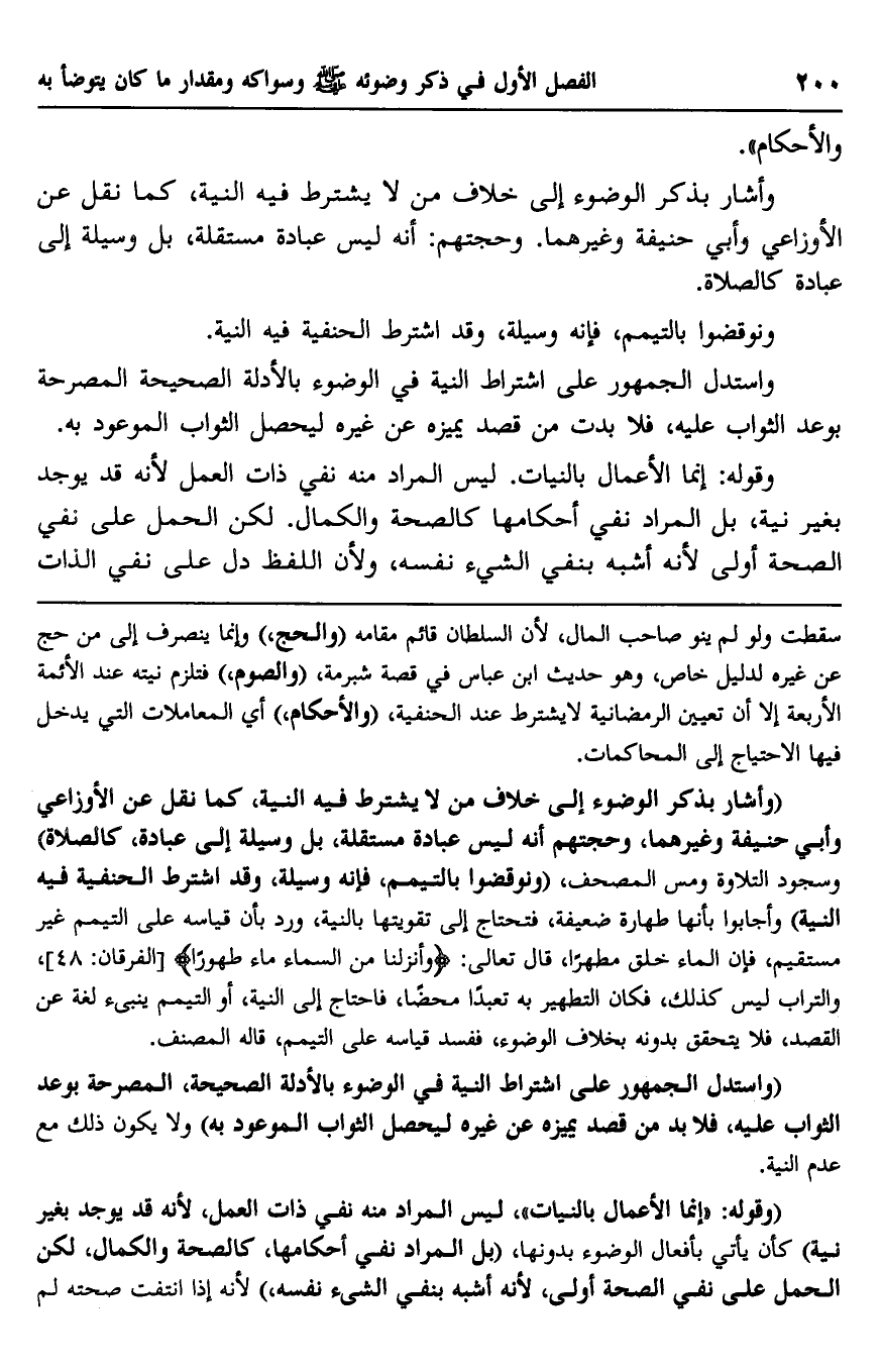 وأشار بذكر الوضوء إلى خلاف من لا يشترط فيه النية، كما نقل عن الأوزاعي وأبي حنيفة وغيرهما.