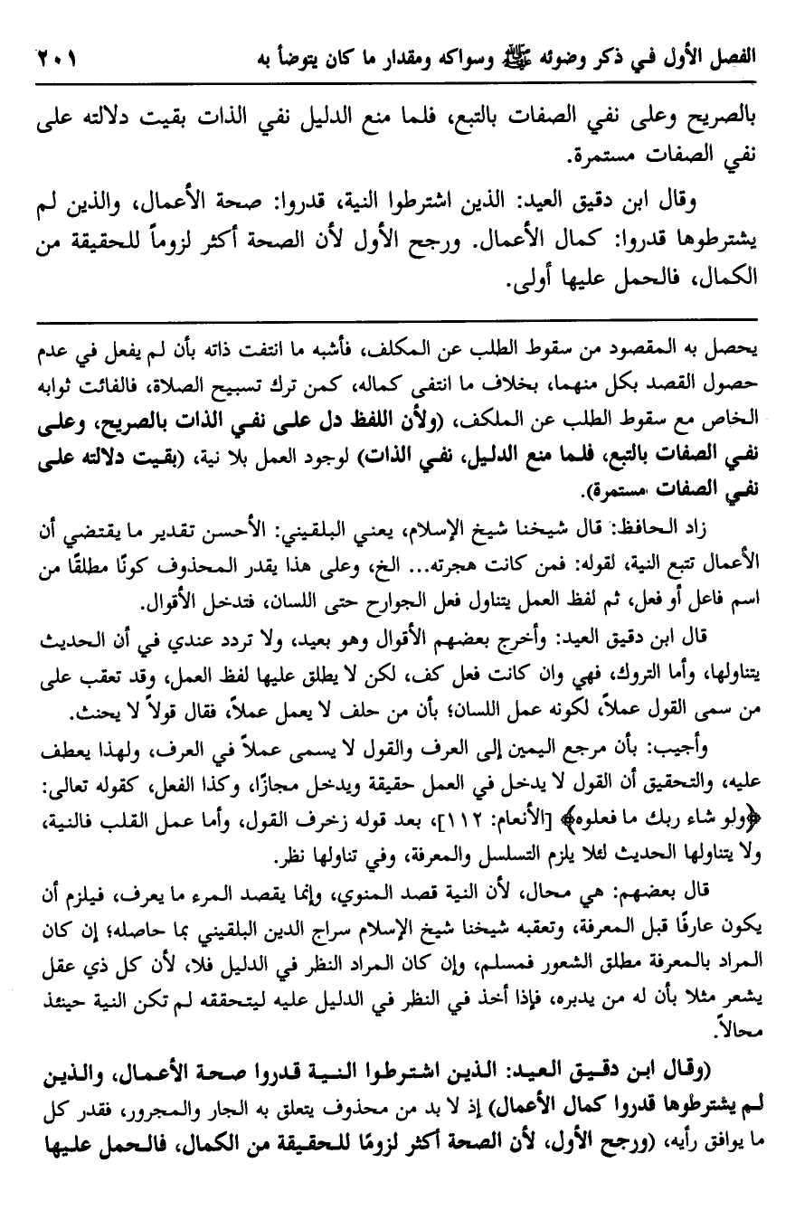 وقال ابن دقيق العيد: الذين اشترطوا النية، قدروا صحة الأعمال، والذين لم يشترطوا قدروا كمال الأعمال, ورجح الأول لأن الصحة أكثر لزوما للحقيقة من الكمال، فالحمل عليها أولى.