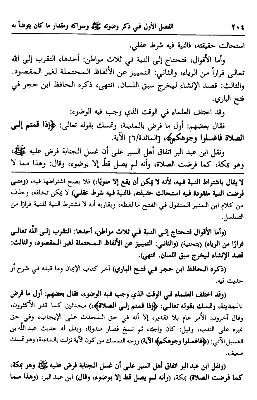 "ونقل ابن عبد البر اتفاق أهل السير على أن غسل الجنابة فرض عليه صلى الله عليه وسلم وهو بمكة، كما فرضت الصلاة" بمكة، "وأنه لم يصل قط إلا بوضوء، وقال" ابن عبد البر: "وهذا مما
