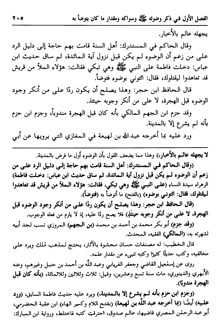 وقال الحاكم في المستدرك: أهل السنة قامت بهم حاجة إلى دليل الرد على من زعم أن الوضوء لم يكن قبل نزول آية المائدة، ثم ساق حديث ابن عباس: دخلت فاطمة على النبي صلى الله عليه وسلم وهي تبكي فقالت: هؤلاء الملأ من قريش قد تعاهدوا ليقتلوك، فقال: "ائتوني بوضوء". فتوضأ.