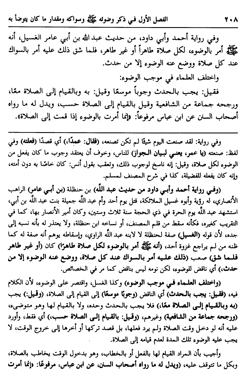 "وفي رواية أحمد وأبي داود من حديث عبد الله" بن حنظلة "بن أبي عامر" الراهب الأنصاري، له رؤية وأبوه غسيل الملائكة، قتل يوم أحد وأم عبد الله جميلة بنت عبد الله بن أبي، استشهد عبد الله يوم الحرة في ذي الحجة سنة ثلاث وستين، وكان أمير الأنصار بها، كما في التقريب كغيره، فكأنه سقط من قلم المصنف أو نساخه: ابن حنظلة، ولا يعتذر له بأنه نسبه إلى جده، لأن قوله "الغسيل" صفة لحنظلة لا لابنه عبد الله الراوي، وإسقاطه يوهم أنه صفة له كما ظنه من لم يراجع غزوة أحد، "أنه صلى الله عليه وسلم أمر بالوضوء لكل صلاة طاهرا" كان "أو غير طاهر فلما شق" صعب "ذلك عليه أمر بالسواك عند كل صلاة، ووضع عند الوضوء إلا من حدث", أي ناقض للوضوء، لكن نومه ليس بناقض كما مر في الخصائص.