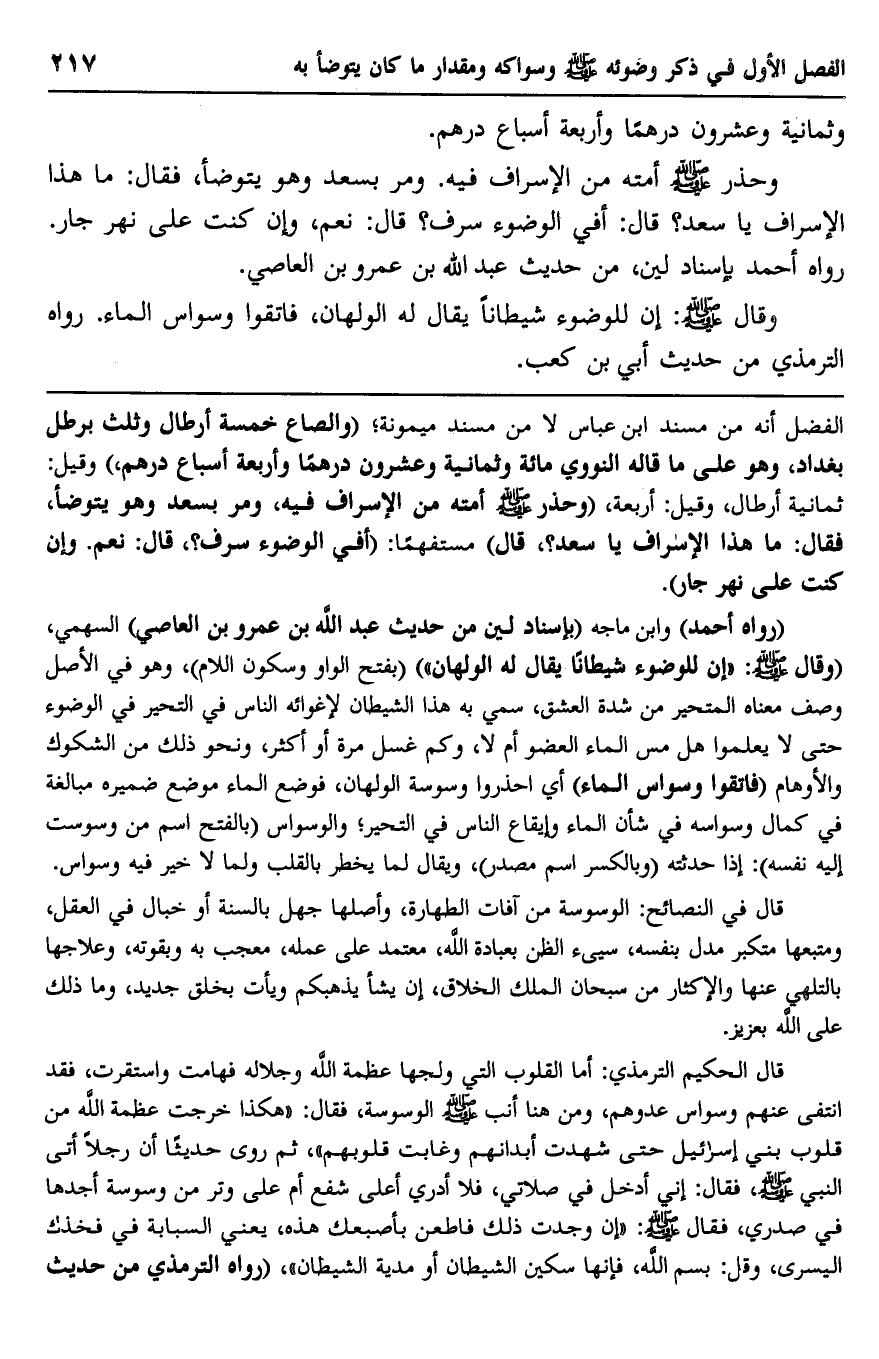 وحذر صلى الله عليه وسلم أمته من الإسراف فيه. ومر بسعد وهو يتوضأ، فقال: "ما هذا الإسراف يا سعد"؟. قال: أفي الوضوء سرف؟ قال: "نعم، وإن كانت على نهر جار". رواه أحمد بإسناد لين، من حديث عبد الله بن عمرو بن العاصي.