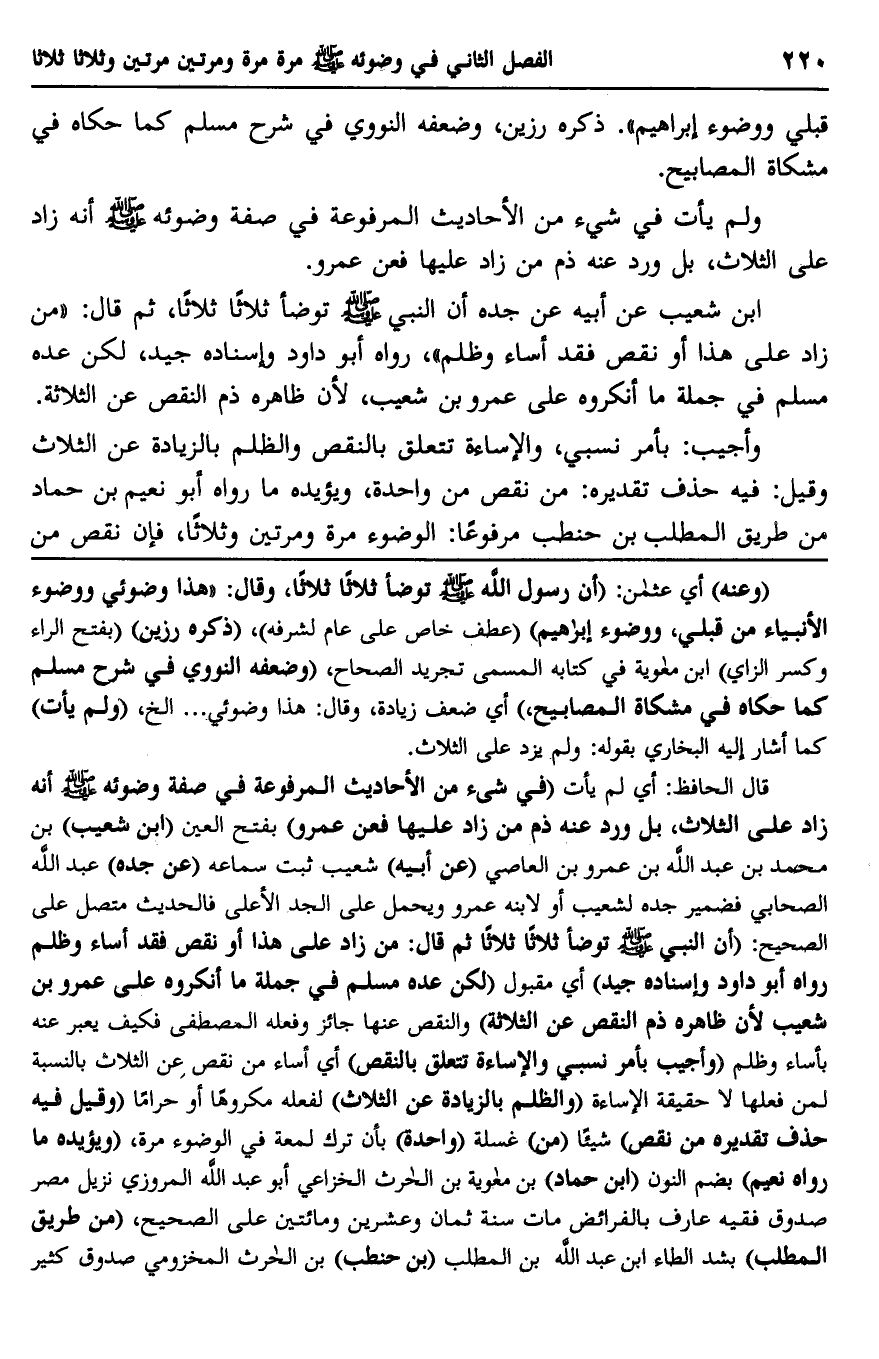 قال الحافظ: أي لم يأت "في شيء من الأحاديث المرفوعة في صفة وضوئه صلى الله عليه وسلم أنه زاد على الثلاث، بل ورد عنه ذم من زاد عليها فعن عمرو" بفتح العين "ابن شعيب" بن محمد بن عبد الله بن عمرو بن العاصي "عن أبيه" شعيب ثبت سماعه "عن جده" عبد الله الصحابي فضمير جده لشعيب أو لابنه عمرو ويحمل على الجد الأعلى فالحديث متصل على الصحيح: "أن النبي صلى الله عليه وسلم توضأ ثلاثا ثم قال: من زاد على هذا أو نقص فقد أساء وظلم رواه أبو داود وإسناده جيد" أي مقبول "لكن عده مسلم في جملة ما أنكروه على عمرو بن شعيب لأن ظاهره ذم النقص عن الثلاثة" والنقص عنها جائز وفعله المصطفى فكيف يعبر عنه بأساء وظلم "وأجيب بأمر نسبي والإساءة تتعلق بالنقص" أي أساء من نقص عن الثلاث بالنسبة لمن علا لا حقيقة الإساءة "والظلم بالزيادة عن الثلاث" لفعله مكروها أو حراما "وقيل: فيه حذف تقديره من نقص" شيئا "من" غسله "واحدة" بأن ترك لمعة في الوضوء مرة، "ويؤيده ما رواه نعيم" بضم النون "ابن حماد" بن معاوية بن الحارث الخزاعي أبو عبد الله المروزي نزيل مصر صدوق فقيه عارف بالفرائض مات سنة ثمان وعشرين ومائتين على الصحيح، "من طريق المطلب" بشد الطاء ابن عبد الله بن المطلب "بن حنطب" بن الحارث المخزومي صدوق كثير