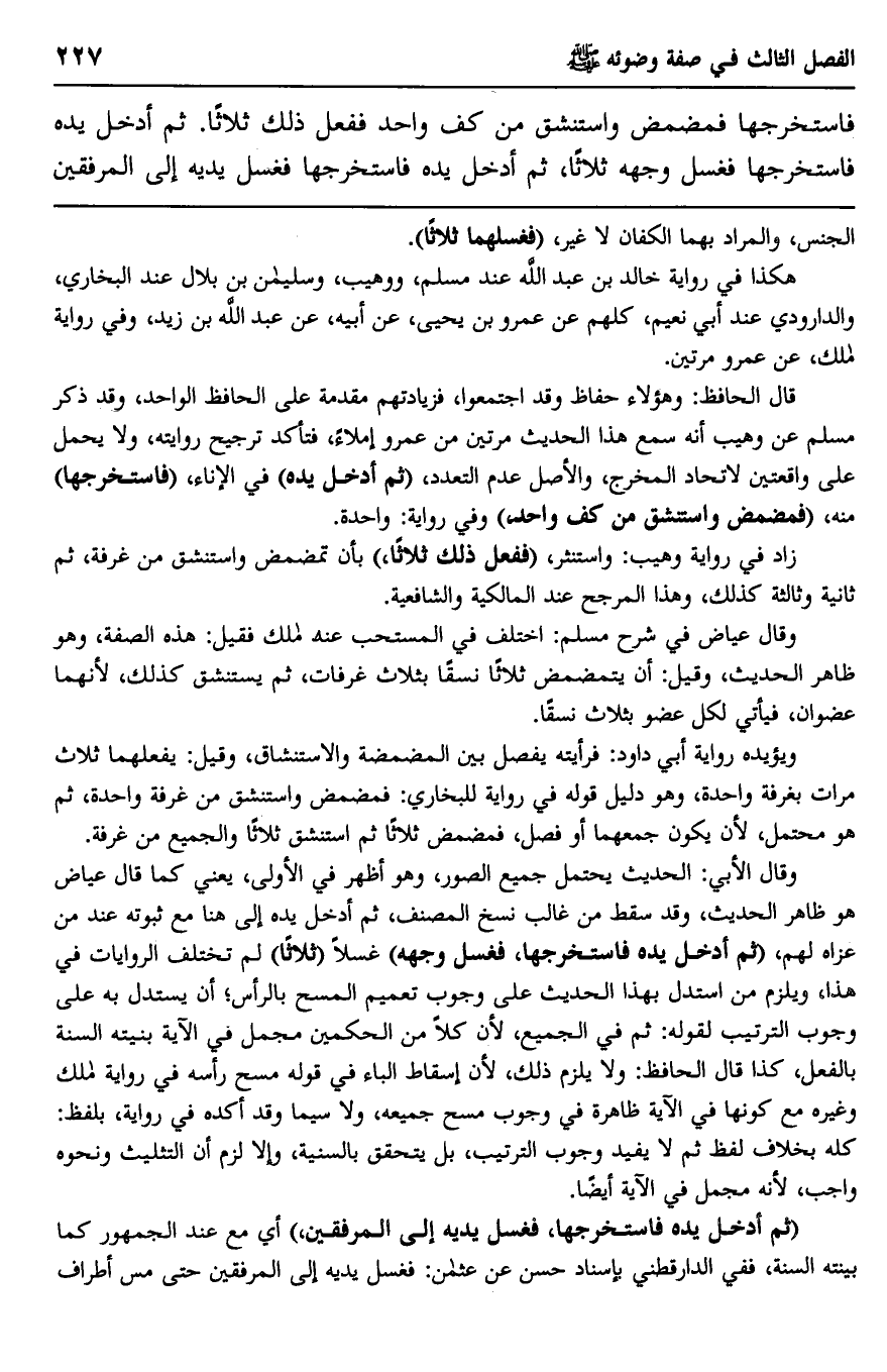 وقال الأبي: الحديث يحتمل جميع الصور، وهو أظهر في الأولى، يعني كما قال عياض هو ظاهر الحديث، وقد سقط من غالب نسخ المصنف، ثم أدخل يده إلى هنا مع ثبوته عند من عزاه لهم، "ثم أدخل يده فاستخرجها، فغسل وجهه" غسلا "ثلاثا" لم تختلف الروايات في هذا، ويلزم من استدل بهذا الحديث على وجوب تعميم المسح بالرأس، أن يستدل به على وجوب الترتيب لوله: ثم في الجميع، لأن كلا من الحكمين مجمل في الآية بينته السنة بالفعل، كذا قال الحافظ: ولا يلزم ذلك، لأن إسقاط الباء في قوله مسح رأسه في رواية مالك وغيره مع كونها في الآية ظاهرة في وجوب مسح جميعه، ولا سيما وقد أكده في رواية بلفظ: كله بخلاف لفظ ثم لا يفيد وجوب الترتيب، بل يتحقق بالسنية، وإلا لزم أن التثليث ونحوه واجب، لأنه مجمل في الآية أيضا.