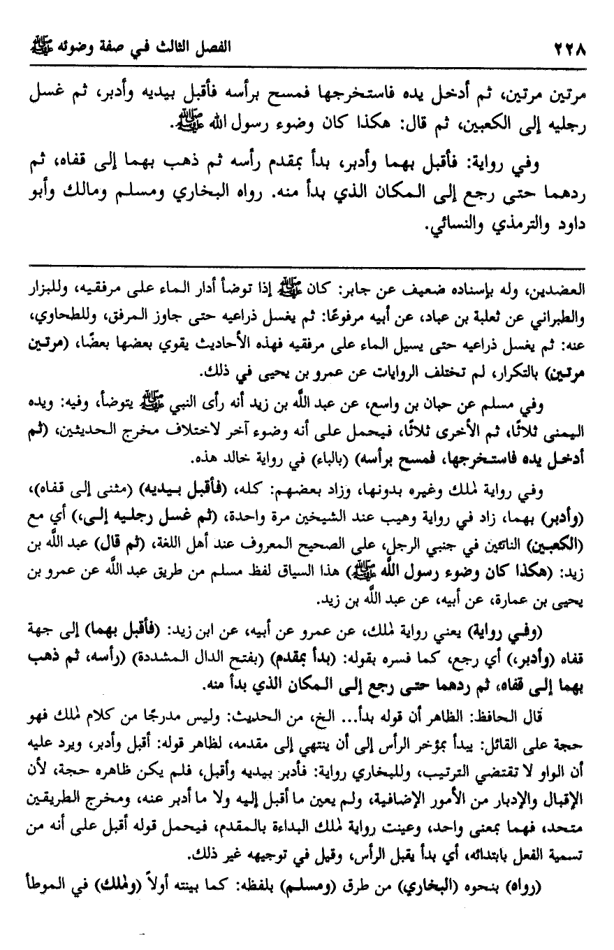 وفي رواية: فأقبل بهما وأدبر، بدأ بمقدم رأسه ثم ذهب بهما، إلى قفاه، ثم ردهما حتى رجع إلى المكان الذي بدأ منه. رواه البخاري ومسلم ومالك وأبو داود والترمذي والنسائي.