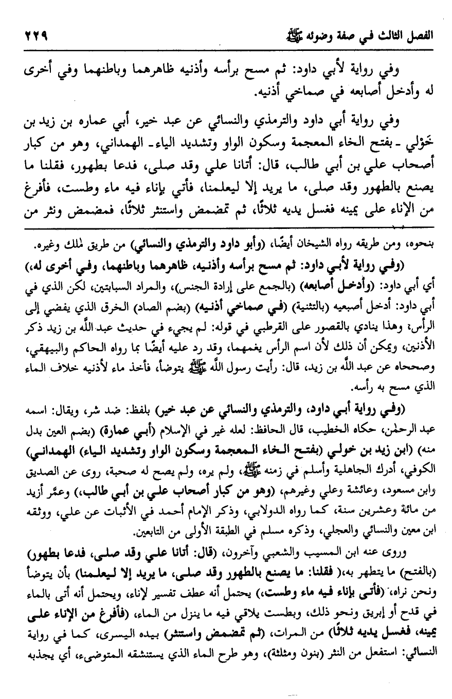 وفي رواية أبي داود والترمذي والنسائي عن عبد خير، أبي عمارة بن زيد بن خولي -بفتح الخاء المعجمة وسكون الواو وتشديد الياء- الهمداني، وهو من كبار أصحاب علي بن أبي طالب، قال: أتانا علي وقد صلى، فدعا بطهور، فقلنا ما يصنع بالطهور، وقد صلى، ما يريد إلا ليعلمنا، فأتي بإناء فيه ماء وطست، فأفرغ من الإناء على يمينه فغسل يديه ثلاثا، ثم تمضمض واستنثر ثلاثا، فمضمض ونثر من