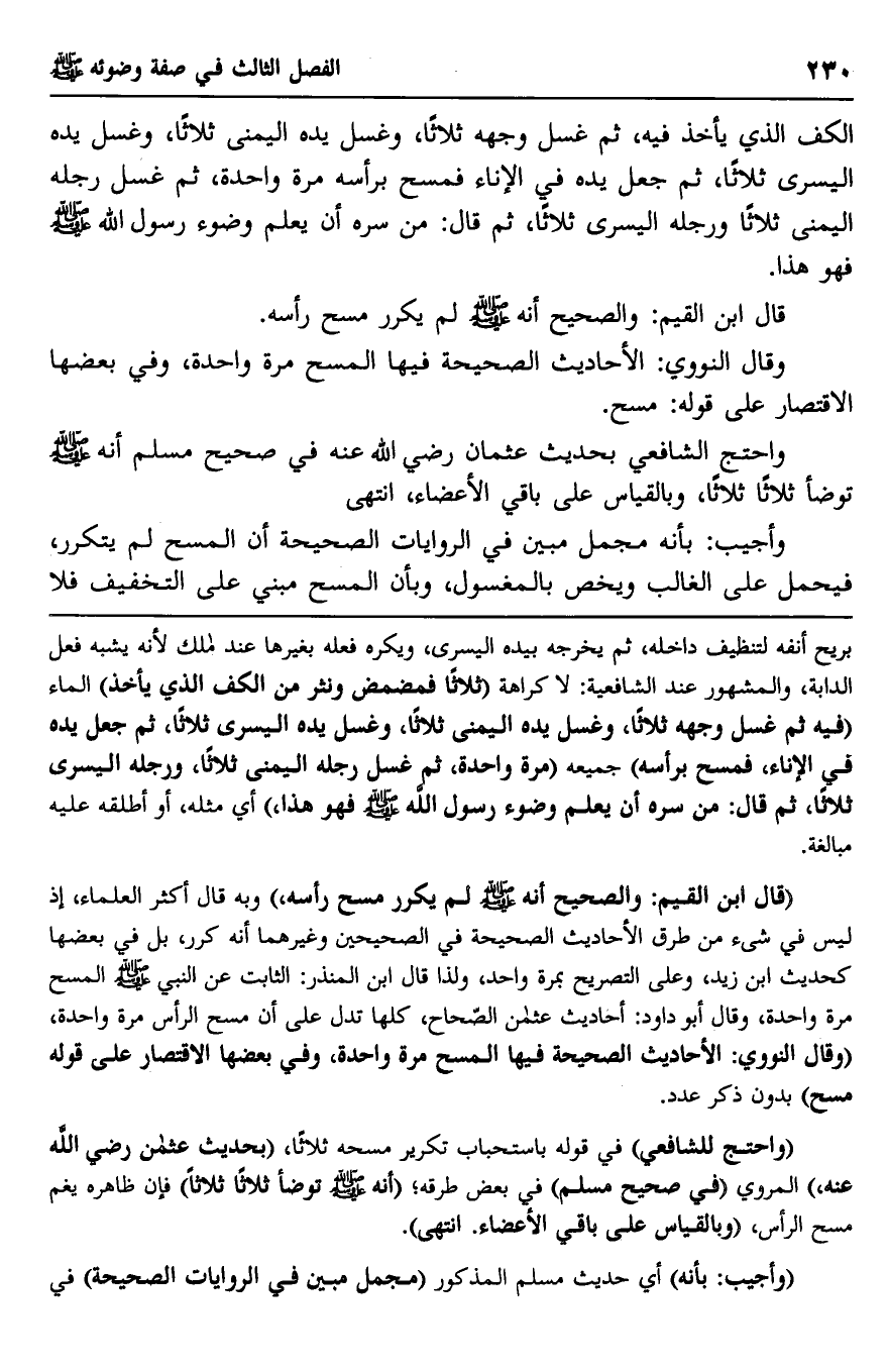 "قال ابن القيم: والصحيح أنه صلى الله عليه وسلم لم يكرر مسح رأسه" وبه قال أكثر العلماء، إذ ليس في شيء من طرق الأحاديث الصحيحة في الصحيحين وغيرهما أنه كرر، بل في بعضها كحديث ابن زيد، وعلى التصريح بمرة واحد، ولذا قال ابن المنذر: الثابت عن النبي صلى الله عليه وسلم المسح مرة واحدة، وقال أبو داود: أحاديث عثمان الصحاح، كلها تدل على أن مسح الرأس مرة واحدة، "وقال النووي: الأحاديث الصحيحة فيها المسح مرة واحدة، وفي بعضها الاقتصار على قوله مسح" بدون ذكر عدد.
