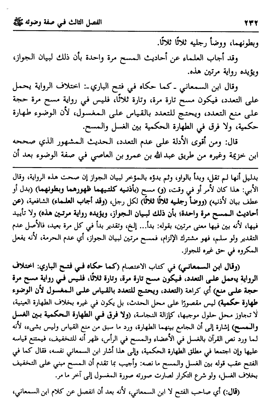 وقال ابن السمعاني -كما حكاه في فتح الباري-: اختلاف الرواية يحمل على التعدد، فيكون مسح تارة مرة، وتارة ثلاثا، فليس في رواية مسح مرة حجة على منع التعدد، ويحتج للتعدد بالقياس على المغسول، لأن الوضوء طهارة حكمية، ولا فرق في الطهارة الحكمية بين الغسل والمسح.