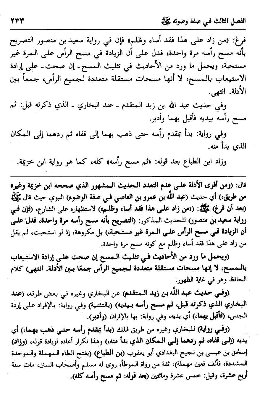"ويحمل ما ورد من الأحاديث في تثليث المسح إن صحت على إرادة الاستيعاب بالمسح، لا إنها مسحات مستقلة متعددة لجميع الرأس جمعا بين الأدلة. انتهى" كلام الحافظ وهو في غاية الظهور.