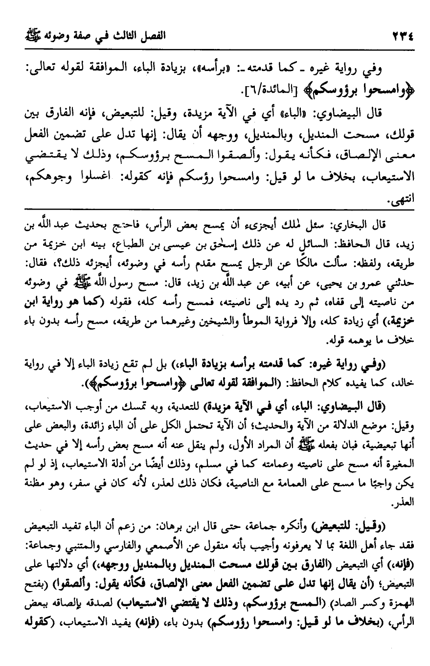 "قل البيضاوي: الباء في الآية مزيدة" للتعدية، وبه تمسك من أوجب الاستيعاب، وقيل: موضع الدلالة من الآية والحديث، أن الآية تحتمل الكل على أن الباء زائدة، والبعض على أنها تبعيضية، فبان بفعله صلى الله عليه وسلم أن المراد الأول، ولم ينقل عنه أنه مسح بعض رأسه إلا في حديث المغيرة أنه مسح على ناصيته وعمامته كما في مسلم، وذلك أيضا من أدلة الاستيعاب، إذ لو م يكن واجبا ما مسح على العمامة مع الناصية، فكان ذلك لعذر، لأنه كان في سفر، وهو مظنة العذر.