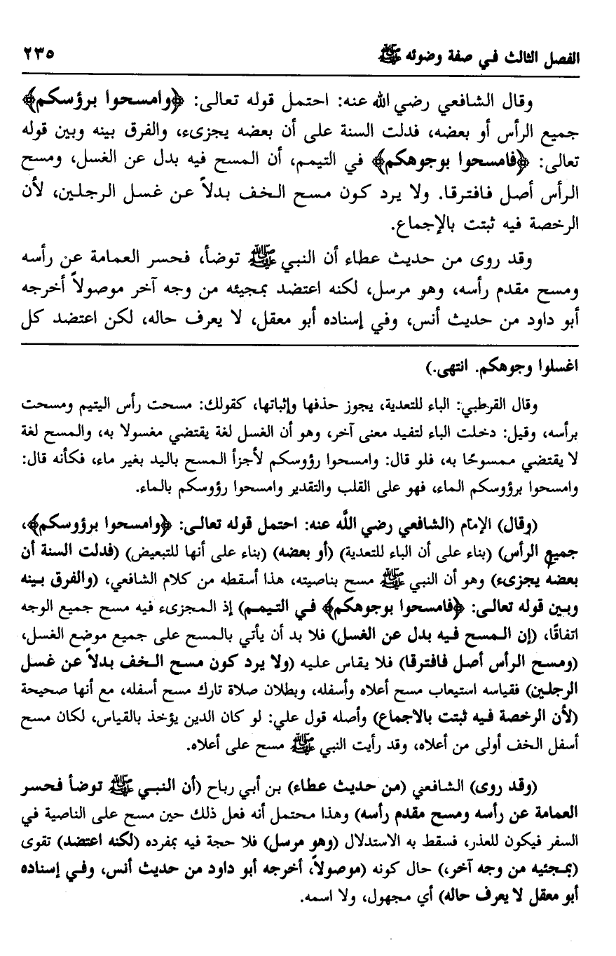 وقال الشافعي رضي الله عنه: احتمل قوله تعالى: {وَامْسَحُوا بِرُءُوسِكُمْ} جميع الرأس أو بعضه، فدلت السنة على أن بعضه يجزئ والفرق بينه وبين قوله تعالى: {فَامْسَحُوا بِوُجُوهِكُمْ} في التيمم، أن المسح فيه بدل عن الغسل، ومسح الرأس أصل فافترقا. ولا يرد كون مسح الخف بدلا عن غسل الرجين، لأن الرخصة فيه ثبتت بالإجماع.