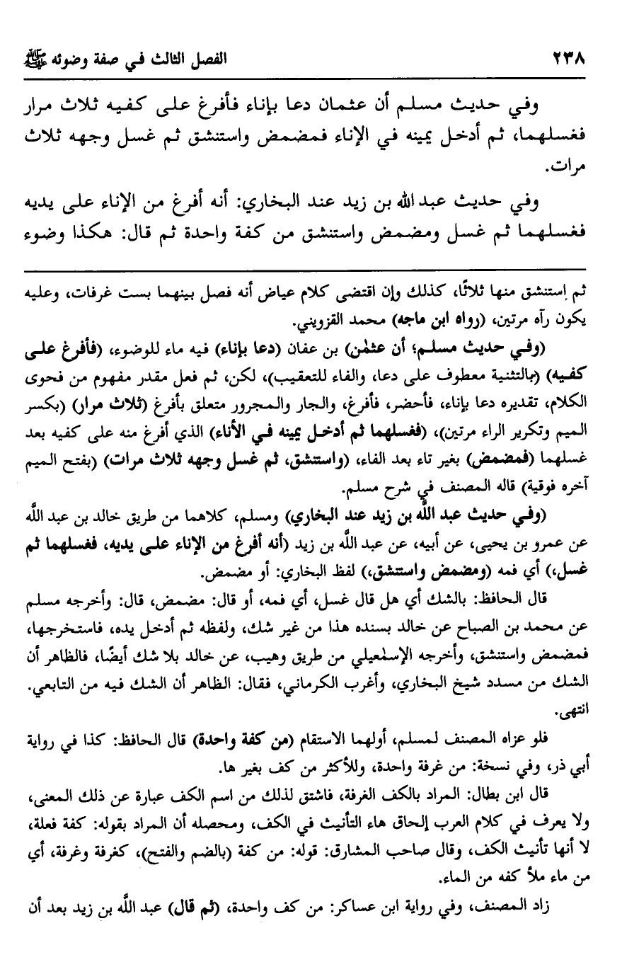 "وفي حديث مسلم، أن عثمان" بن عفان "دعا بإناء" فيه ماء للوضوء، "فأفرغ على كفيه"، "بالتثنية معطوف على دعا، والفاء للتعقيب" لكن، ثم فعل مقدر مفهوم من فحوى الكلام، تقديره دعا بإناء فأحضر، فأفرغ، والجار والمجرور متعلق بأفرغ "ثلاث مرار"، "بكسر الميم وتكرير الراء مرتين"، "فغسلهما ثم أدخل يمينه في الإناء" الذي أفرغ منه على كفيه بعد غسلهما "فمضمض" بغير تاء بعد الفاء، "واستنشق، ثم غسل وجهه ثلاث مرات"، "بفتح الميم آخره فوقية" قاله المصنف في شرح مسلم.