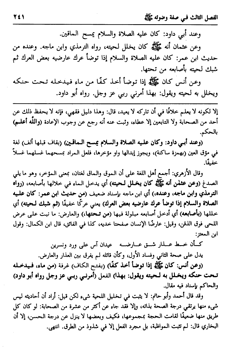 وعن عثمان أنه صلى الله عليه وسلم كان يخلل لحيته، رواه الترمذي وابن ماجه. وعنده من حديث ابن عمر: كان عليه الصلاة والسلام إذا توضأ عرك عارضيه بعض العرك ثم شبك لحيته بأصابعه من تحتها.