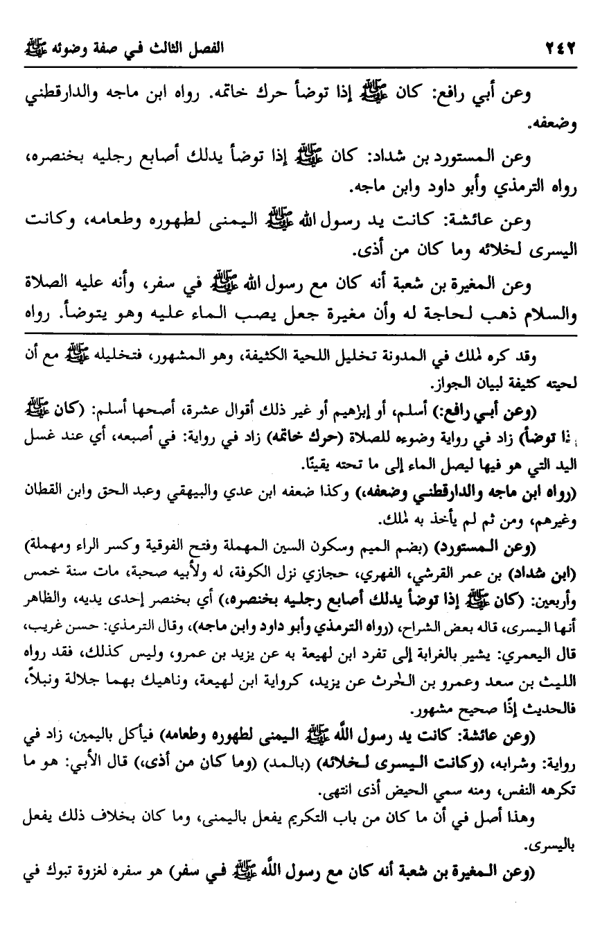 وعن أبي رافع: كان صلى الله عليه وسلم إذا توضأ حرك خاتمه. رواه ابن ماجه والدارقطني وضعفه.