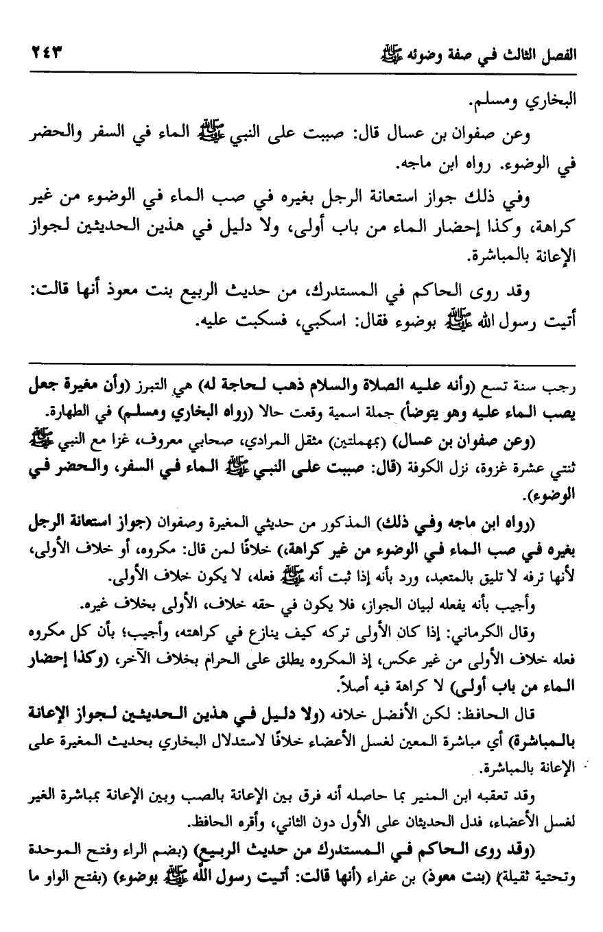 "رواه ابن ماجه وفي ذلك المذكور من حديثي المغيرة وصفوان "جواز استعانة الرجل بغيره في صب الماء من غير كراهة" خلافا لمن قال: مكروه، أو خلاف الأولى، لأنها ترفه لا تليق بالمتعبد، ورد بأنه إذا ثبت أنه صلى الله عليه وسلم فعله، لا يكون خلاف الأولى.