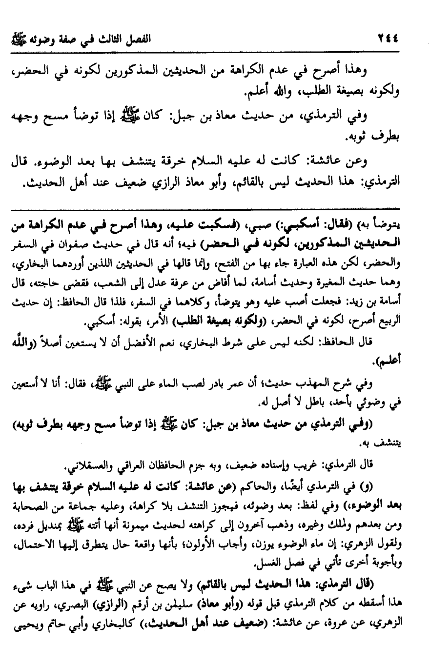 وعن عائشة: كانت له عليه السلام خرقة يتنشف بها بعد الوضوء. قال الترمذي: هذا الحديث ليس بالقائم، وأبو معاذ الرازي ضعيف عند أهل الحديث.