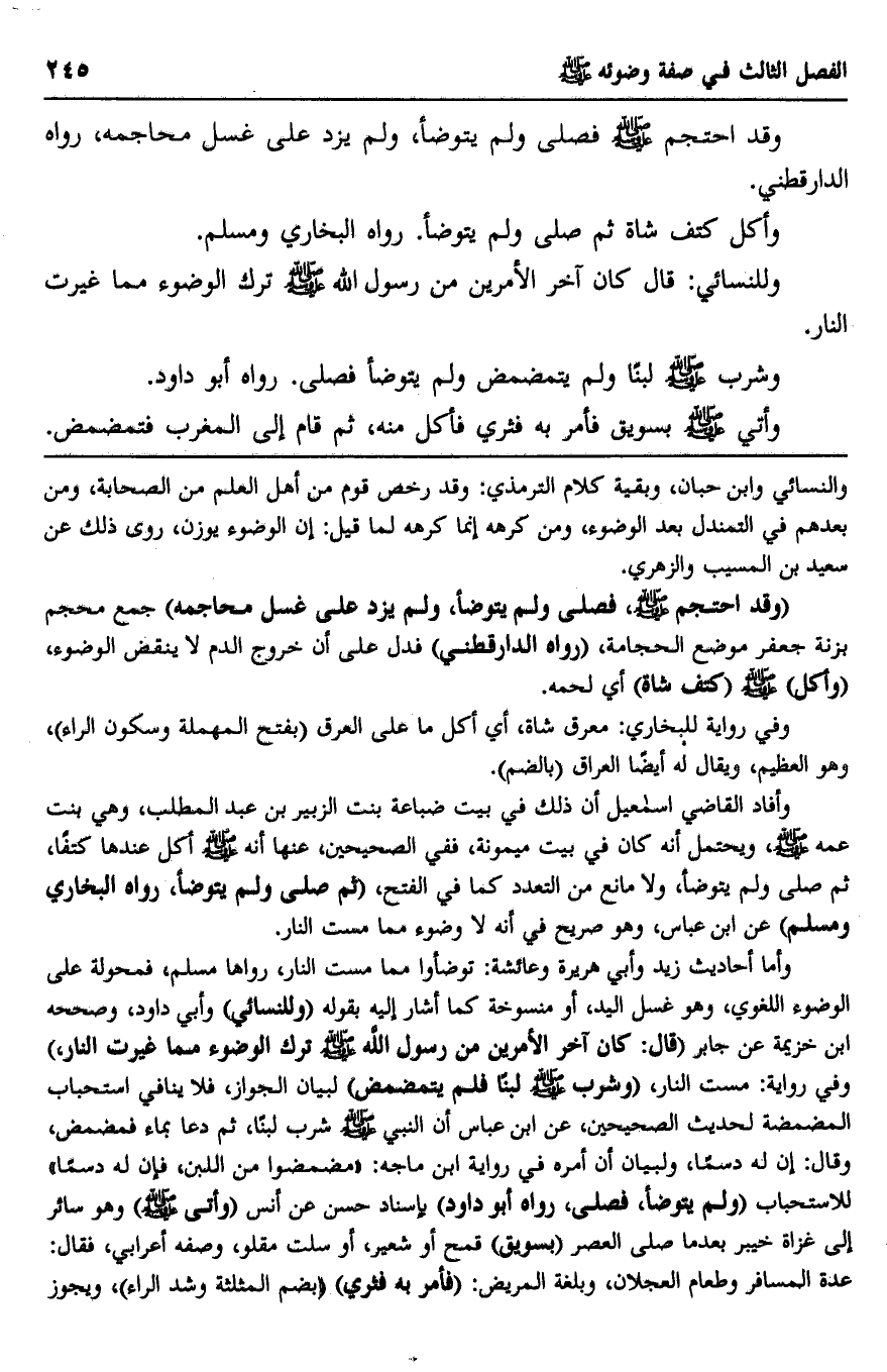 "وقد احتجم صلى الله عليه وسلم فصلى ولم يتوضأ، ولم يزد على غسل محاجمه" جمع محجم بزنة جعفر موضع الحجامة، "رواه الدارقطني" فدل على أن خروج الدم لا ينقض الوضوء، "وأكل" صلى الله عليه وسلم " كتف شاة" أي لحمه.